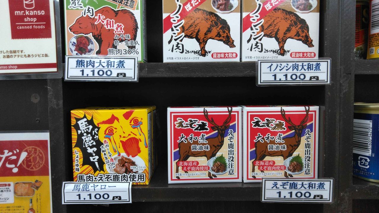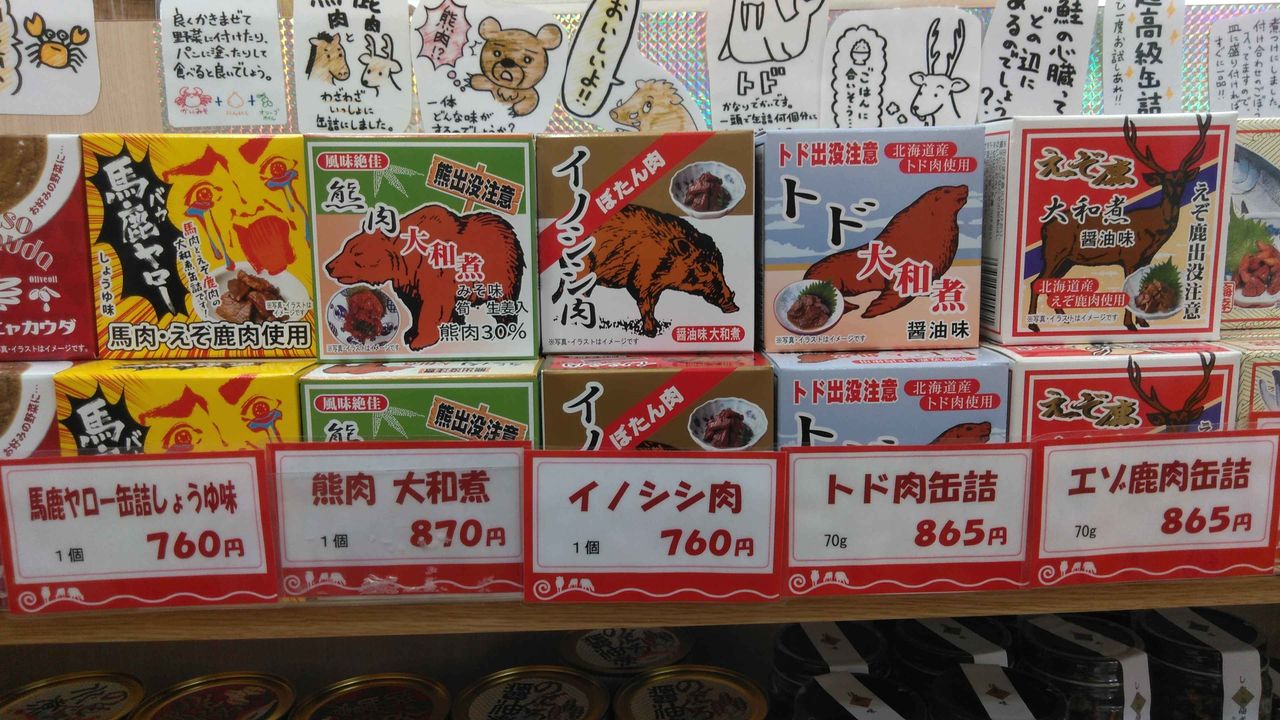 「トド」865円、「エゾ鹿」865円である。しかも普通の缶詰よりも小さいのだ。昔、鹿のステーキは食ったことがあるが、熊とトドは食ったことがない。よほど買おうかと思ったが、高い肉を買って、脂質も高かったら目も当てられないので、我慢した。