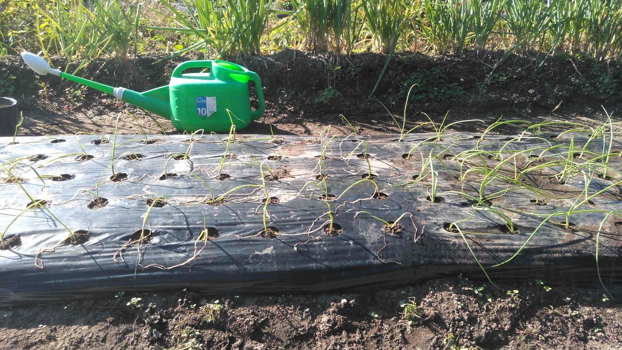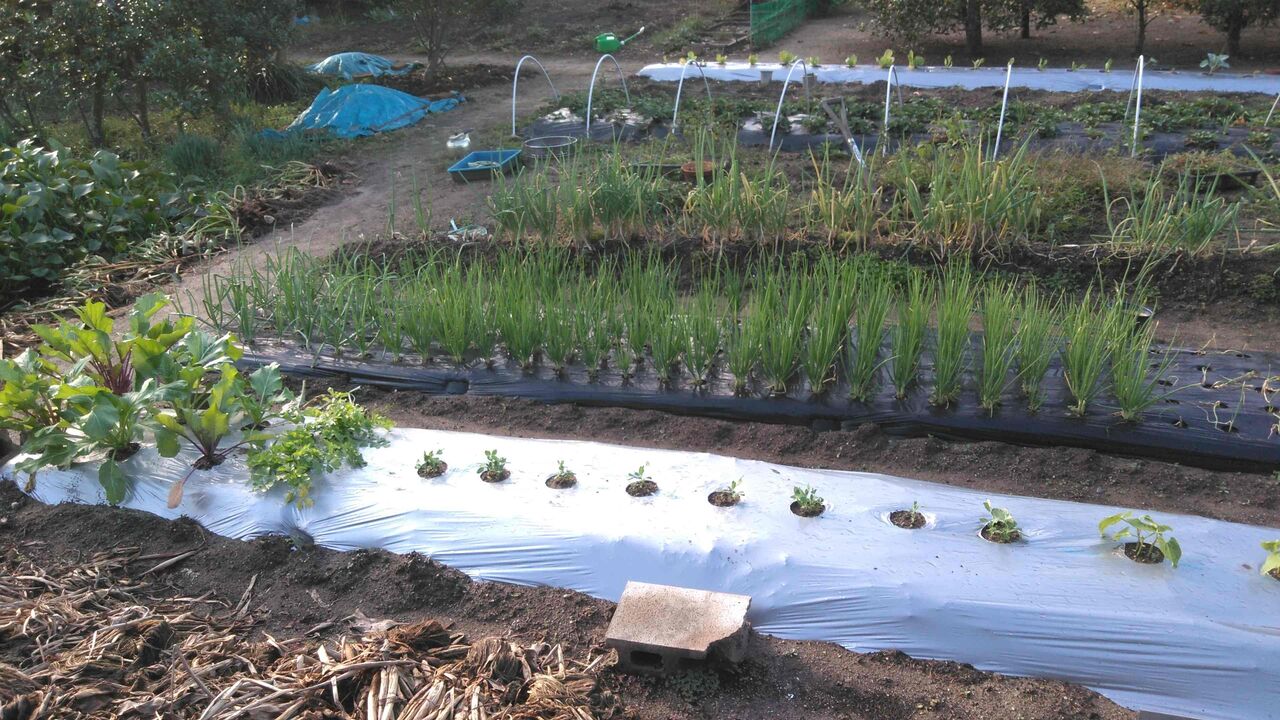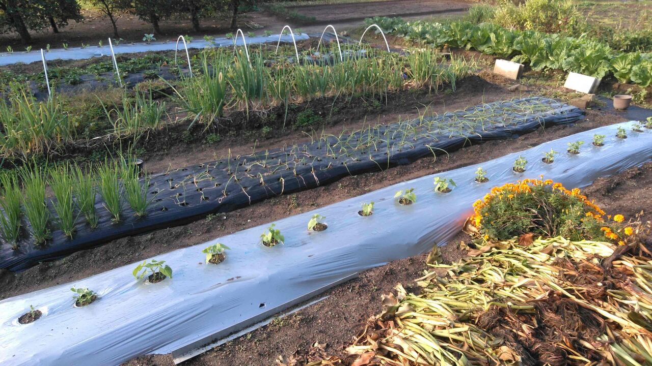 10月29日に極早生玉ねぎ(スーパーハイゴールド)50本を植えるが、これが前代未聞の大失敗。贔屓の田中種苗では極早生は100本束でしか売ってなくて、仕方なく近所のホームセンターで50本束を求めたのだが、これが売れ残りの半額のさらに2割引きというトンデモお粗末苗。黄色く変色して枯れかけている。よほど他の店を回ろうかと思ったが、早く玉ねぎを植えて、秋の農作業を終えたくてままよと買ってしまう。ネギは強いから大丈夫だと思ったのであるが、右の11月1日に植えた、晩生の(もみじ3号)100本と比べたら色と勢いの違いは一目瞭然。