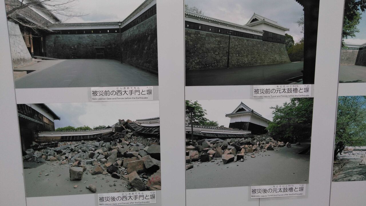 震災前と震災後の比較写真パネル。震災直後の写真だが、現在それほど回復したようには思えない。