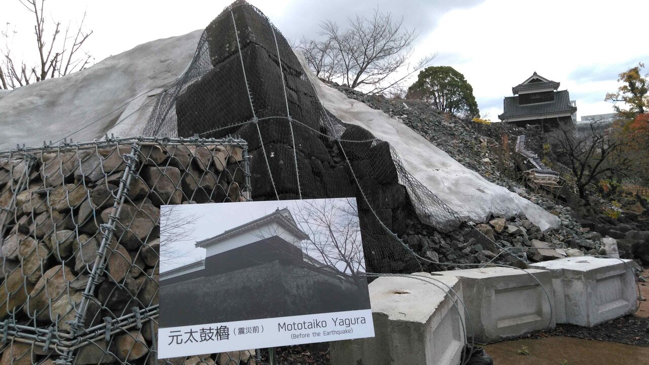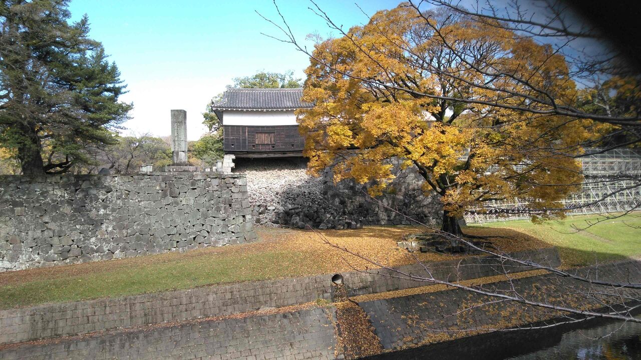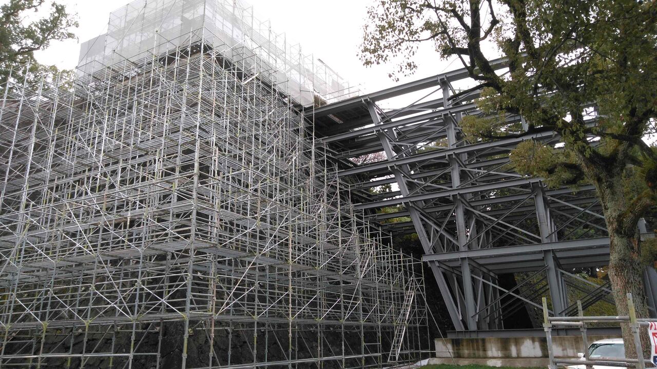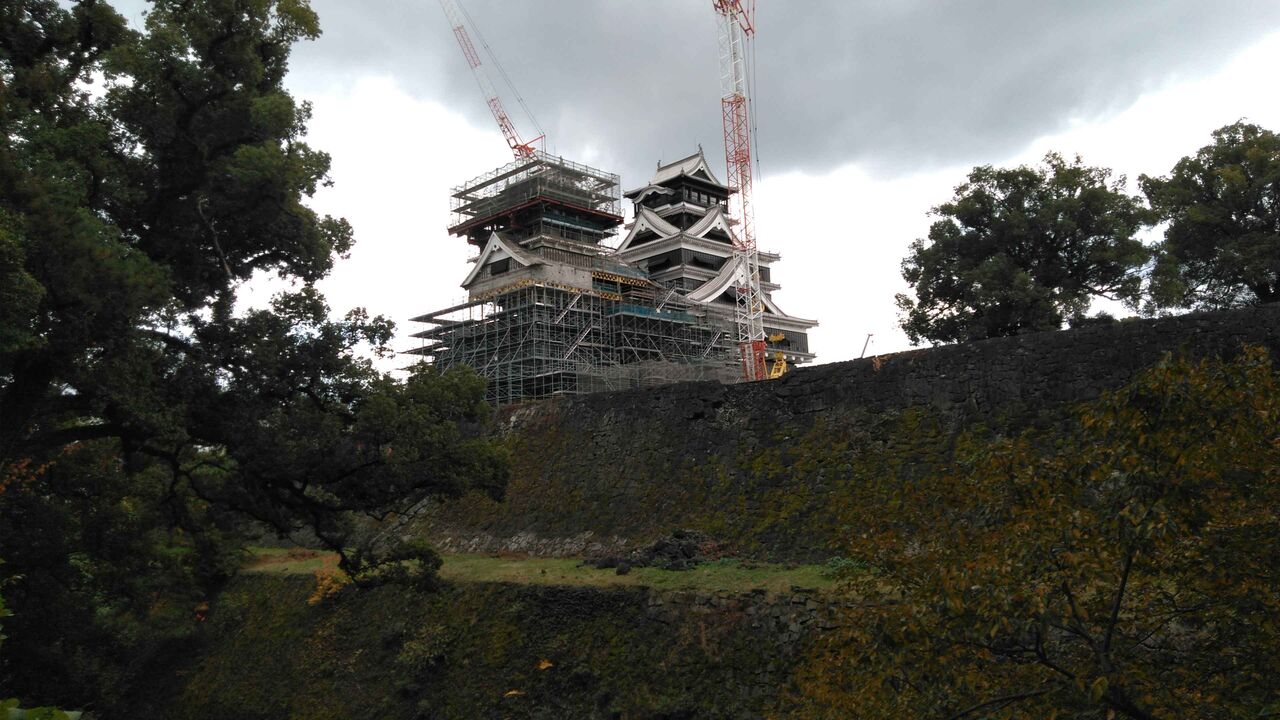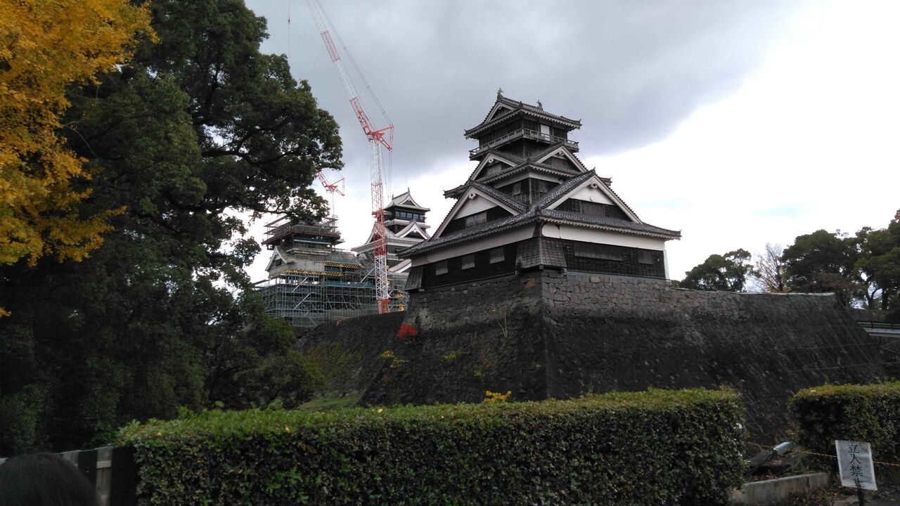 宇土櫓の向こうに見えるのが天守閣。崩れる前から天守閣は昭和新城であり、コンクリート製で松江城のような江戸時代がそっくり残っているような城ではなかった。そんなに一生懸命に再建するほどの文化財的価値はないと思うのだが、熊本のシンボルとしての価値を優先しているのだろう。