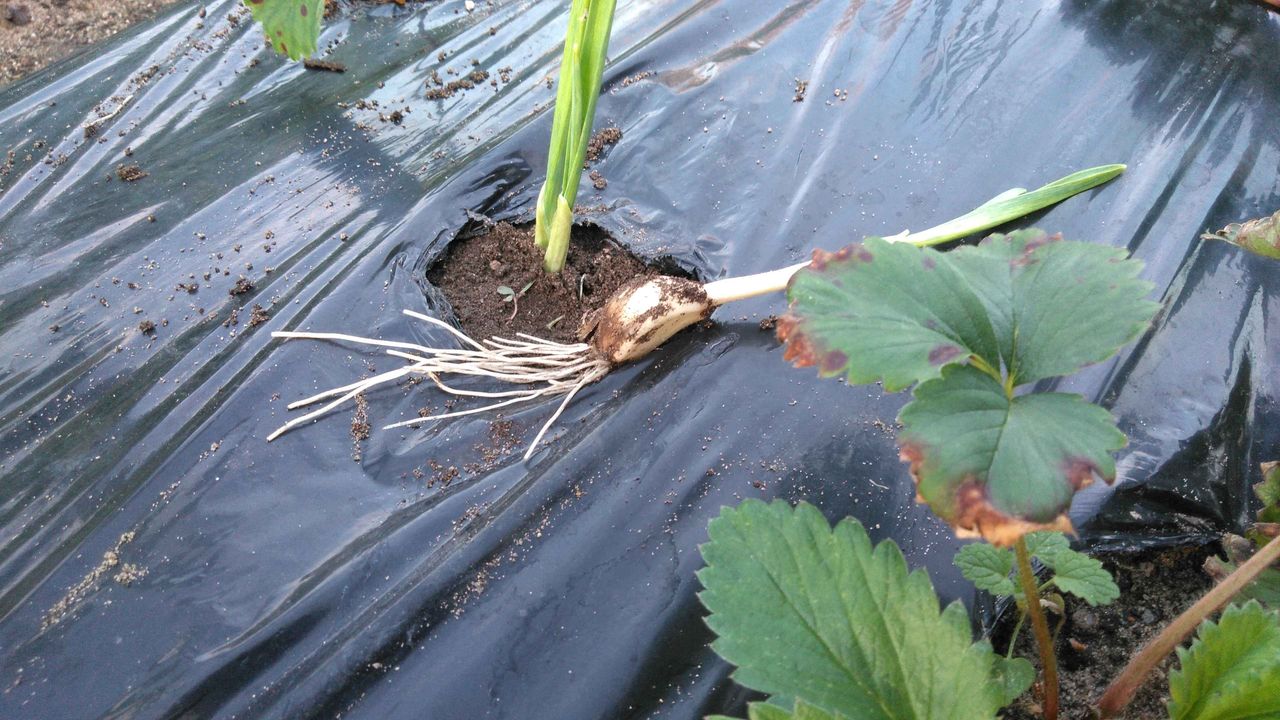 イチゴの葉に大きな毛虫を発見。ニンニクを植えたら虫が来ないと言う話ではなかったのか。しっかり大きい奴が来て、葉っぱをむしゃむしゃと食っておった。
