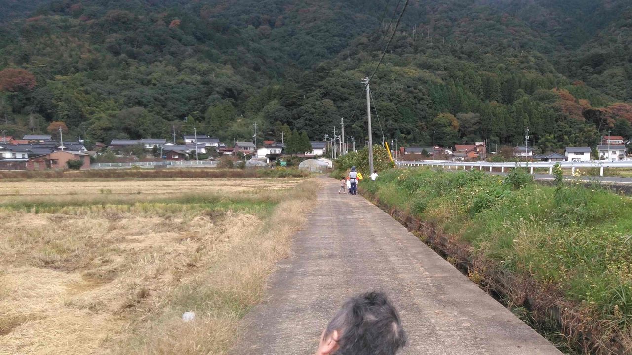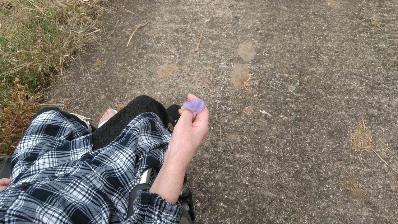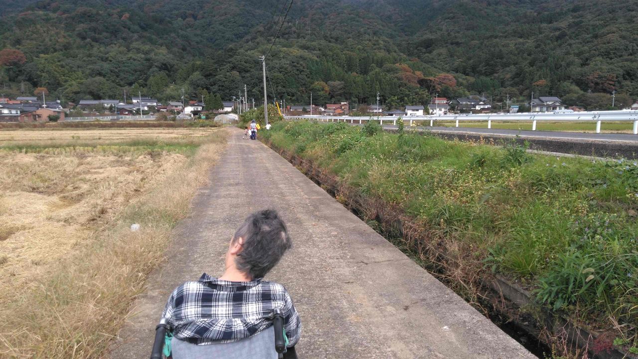 遠くに小さく見えるのが幼稚園児の散歩。妻は子供が大好きなので側に行ったら、幼稚園児が野の花をくれる。帰りは特養の前まで幼稚園児に車椅子を押すのを手伝ってもらう。バイバイ。手を振って別れる。