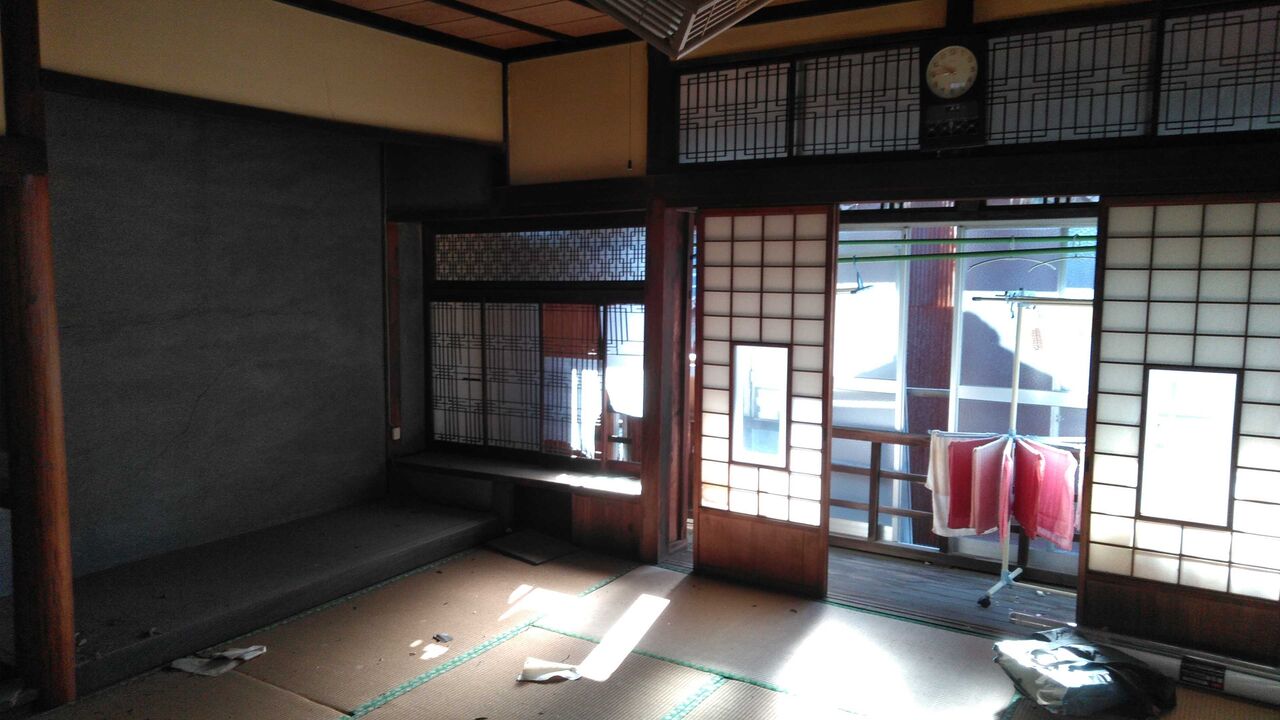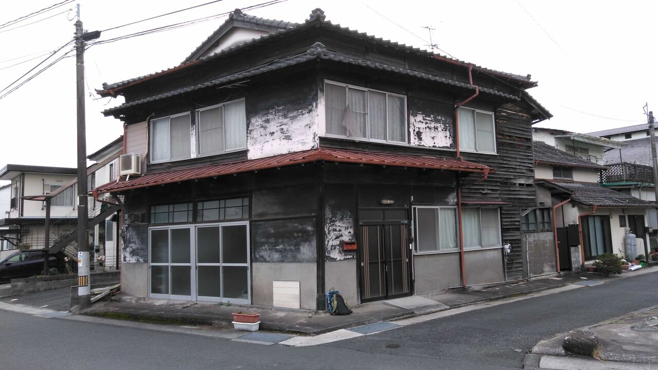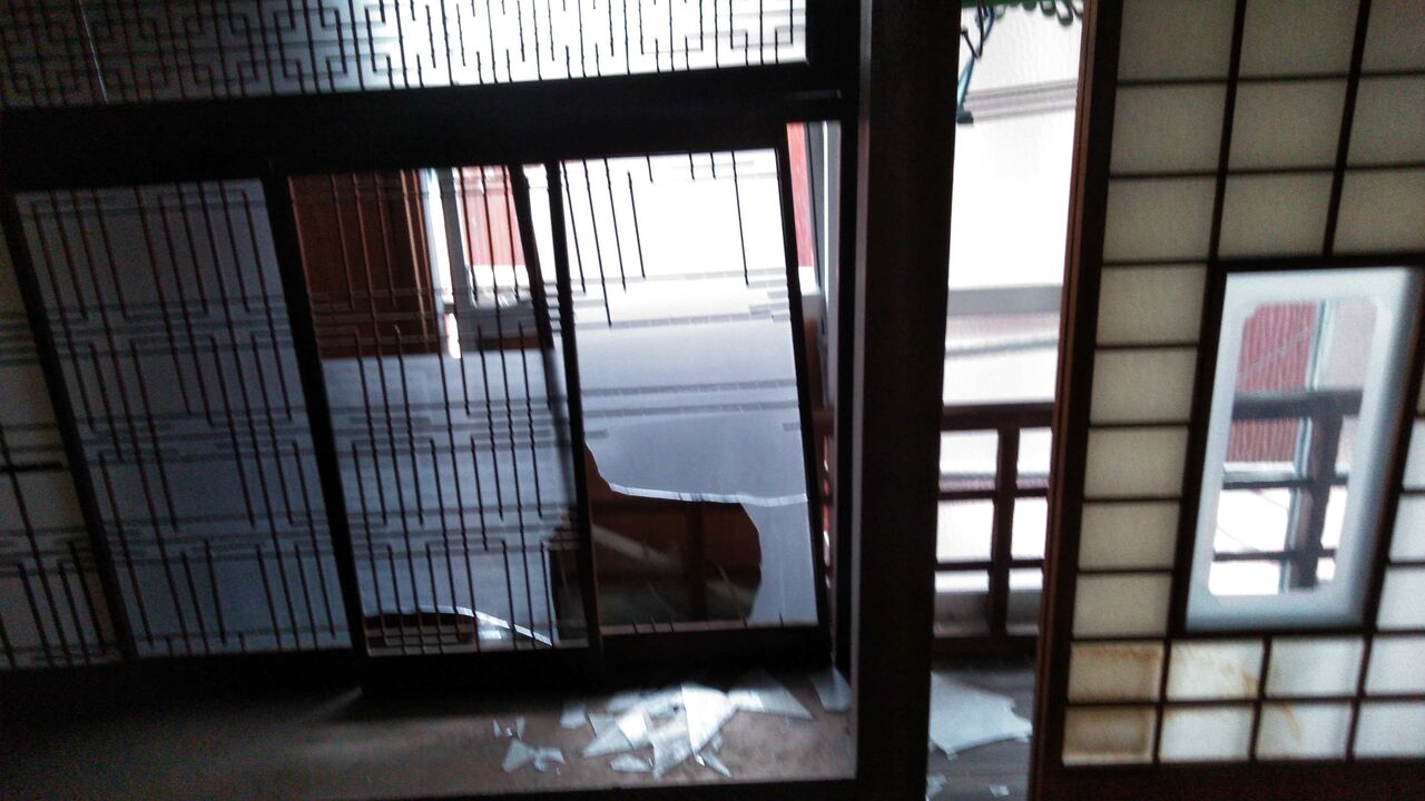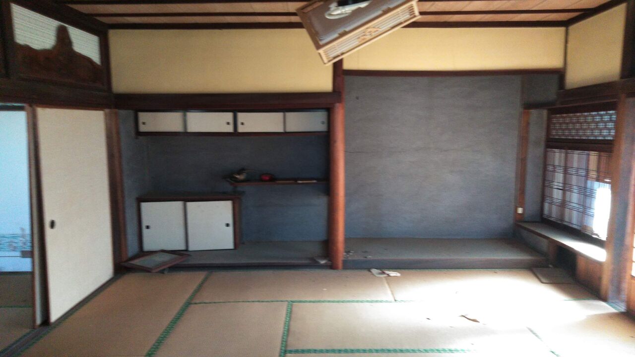 熊本市の南の外れに近い川尻という町にある。2007年に義母が施設に入り、2013年に死亡。12年間無人。義母が入院中に1度頼まれて入ったことがあっただけで、震災後も家が心配だったが、妻の介護もあり、ずっと放っておいた。大正の末に建てられた料亭だったらしいが、もう限界に来ていたところに地震に襲われ、処分するしかなくなったのである。風雪のせいか、地震のせいか、壁板も落ちてぼろぼろである。鍵をなくしてしまい、救急の鍵屋を呼ぶ。鍵が錆びついているせいか開けられないので、横の窓を外して入るが、特別な料金がかかるとかで3万円も取られる。その上、鍵の交換に3万円、諸費用消費税をくわえて8万600円も取られる。その瞬間、ため息が出て、どんよりとした気分で内部に入る。