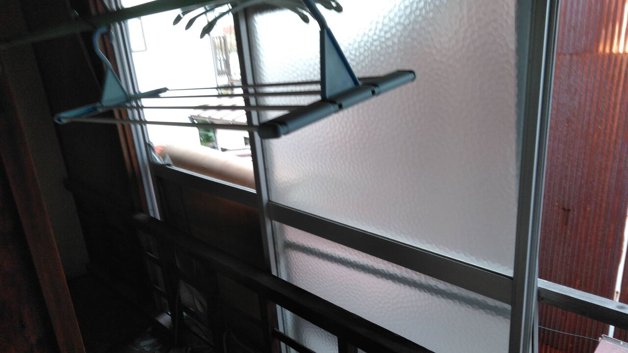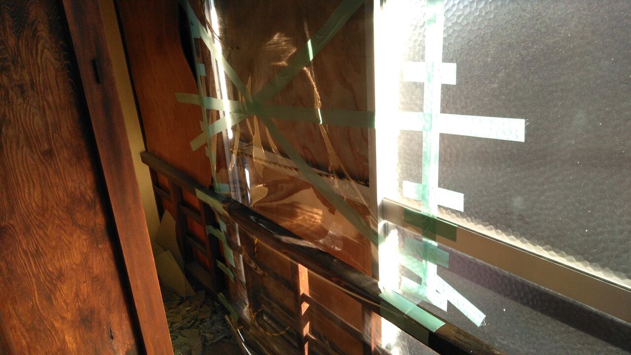 窓の外からカバーにしていたベニヤを起こして紐で固定。内からはテーブルクロス用のビニールを張って雨風を防ぐ。