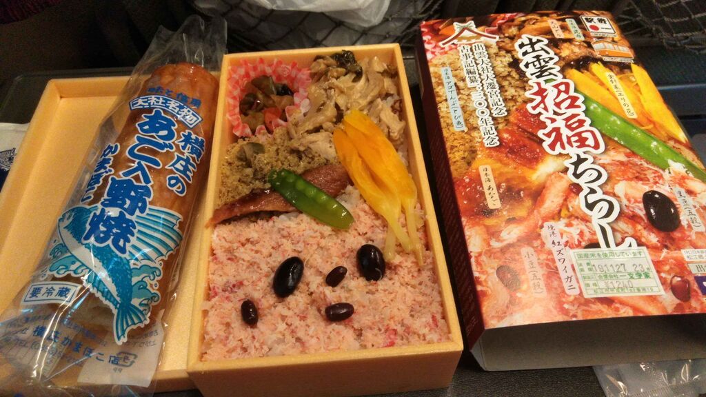 車内販売なんかもちろんないので駅弁とあご野焼きを買って乗り込む。野焼きをかじりながら弁当を食う。