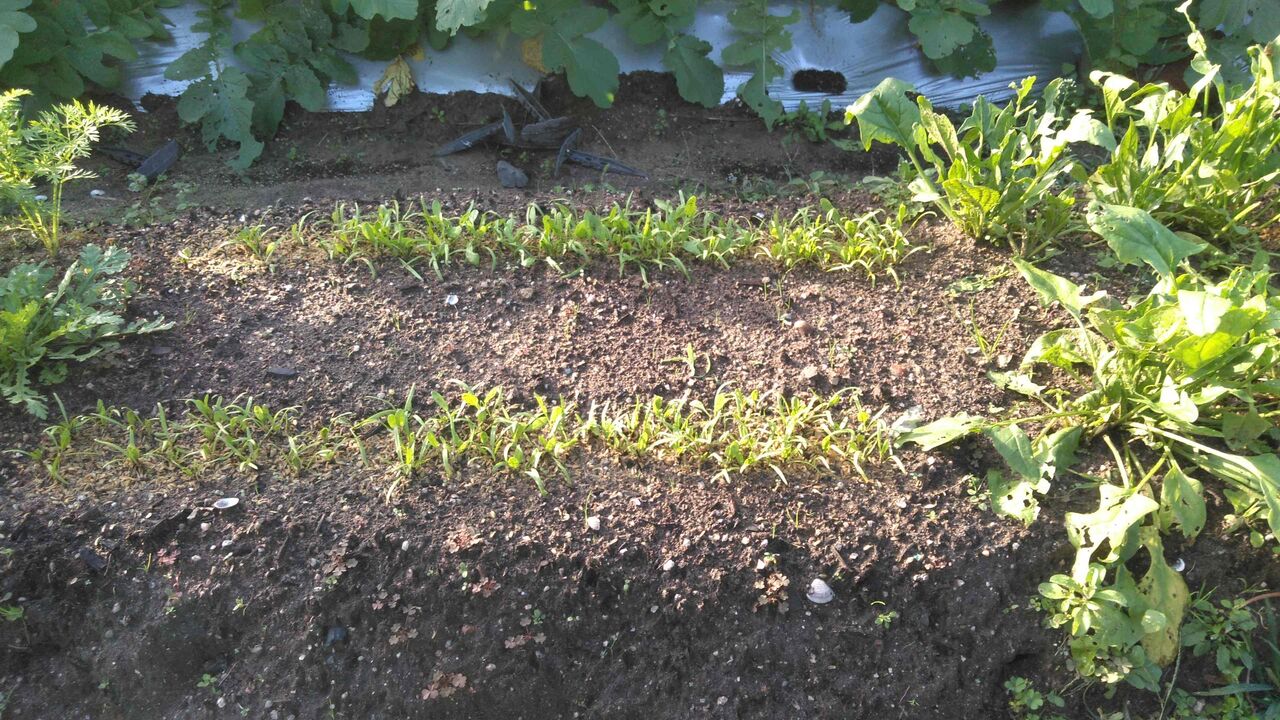 ほうれん草の第2弾が芽を出した。今年のほうれん草は出来が良くない。どうやら石灰が足りなかったようだ。本を読むと、日本の土壌は元々酸性が強いのでしっかり石灰を撒いてアルカリ性にしないといけないのだそうだ。畑先生は畑一面真っ白、厚化粧の白粉のように石灰を撒く。いつも半ば呆れて見ていたが、あれが正しかったのだ。来年からは素直に見習おう。