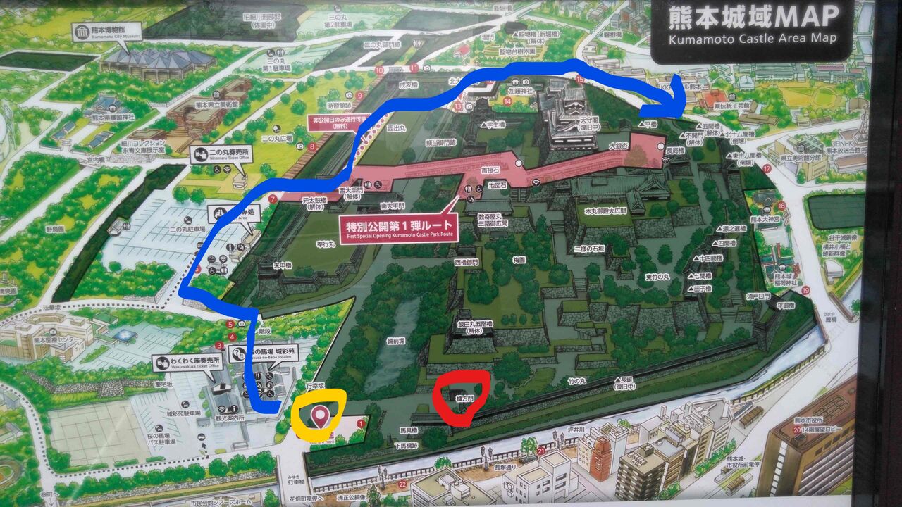 案内板の赤丸が櫨方門。黄丸が案内板。青い道筋を歩く。赤の道は天守閣への見学ルートだが平日は通れず。土日と特別な日だけ通れるようだ。