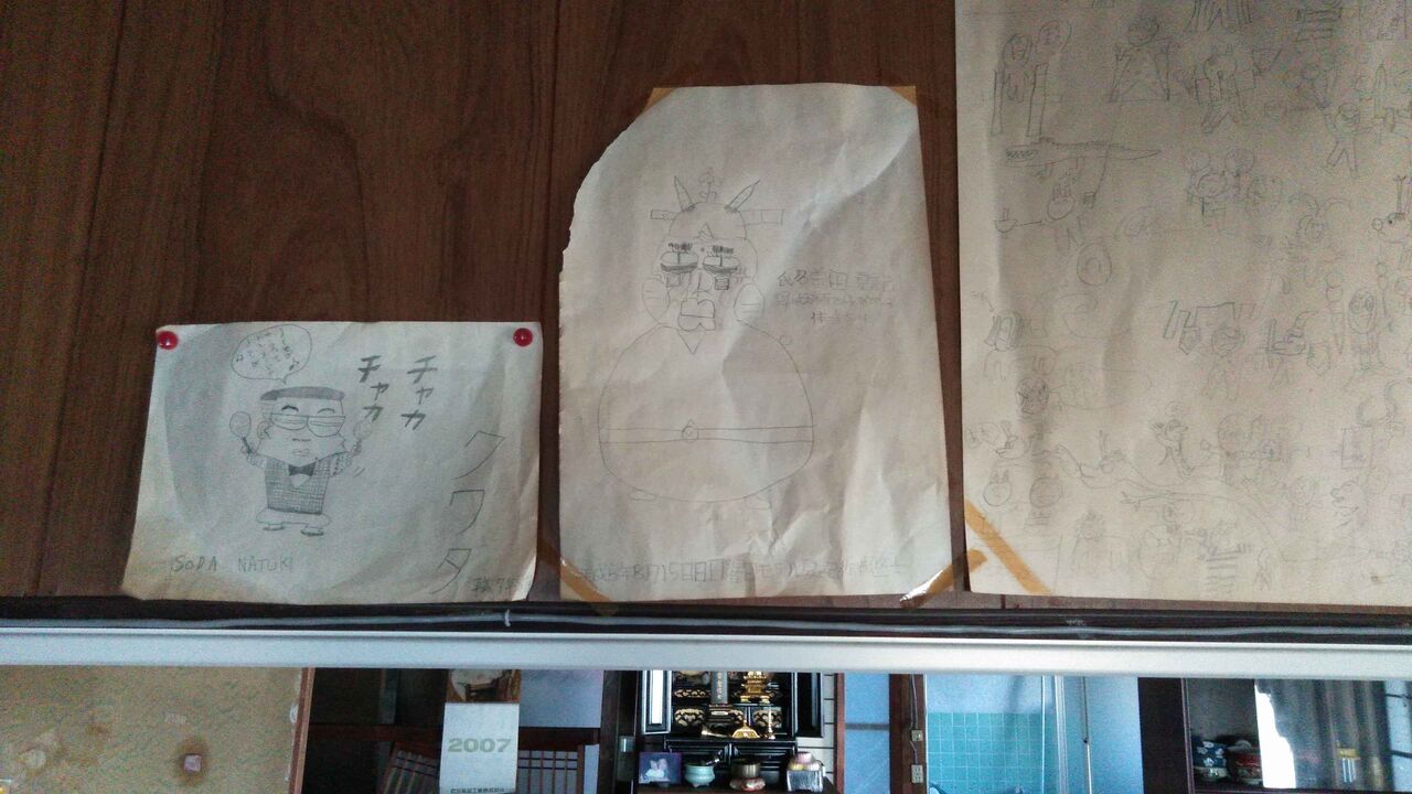 階下の義母のベッドのある部屋の壁に子供たちが描いた絵が残っていた。色あせて消えかかっていた。娘が4、5歳の頃のもののようだ。