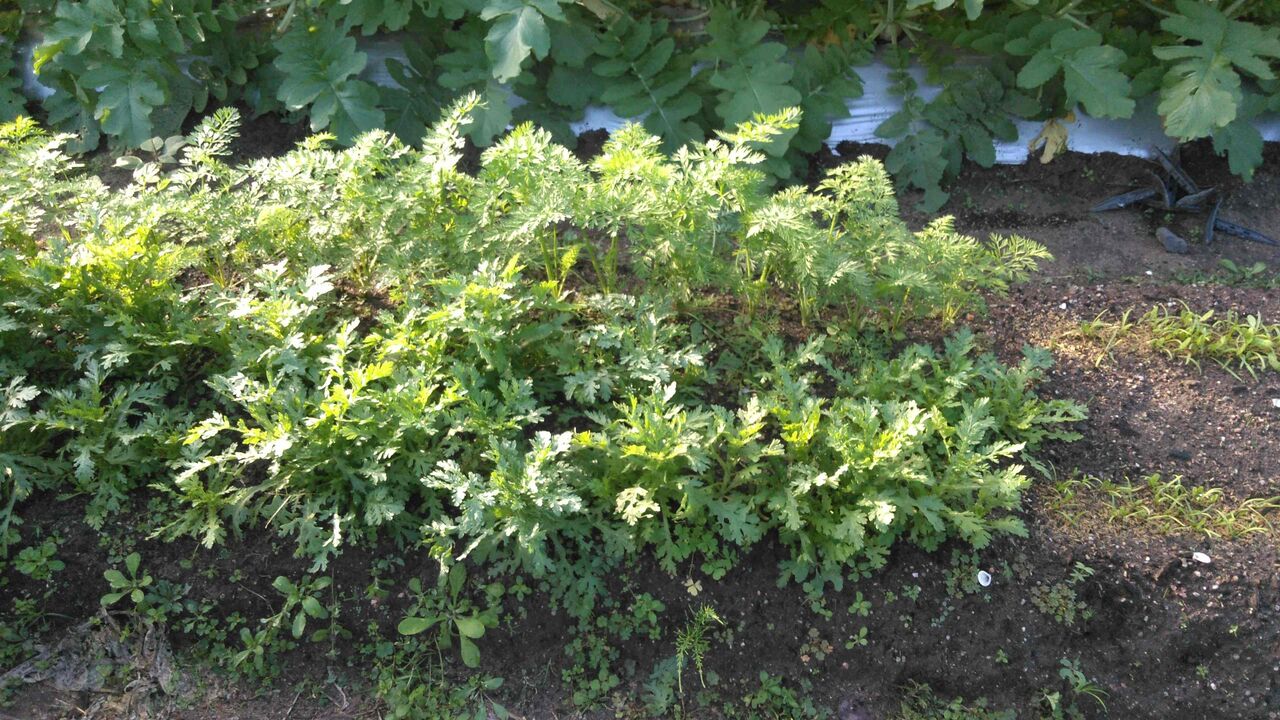 隣の写真は、手前が春菊で向こうが人参。春菊はどんどん食べている。人参はまだ細いが、この分なら食べられそうなのが出来そうな雰囲気である。