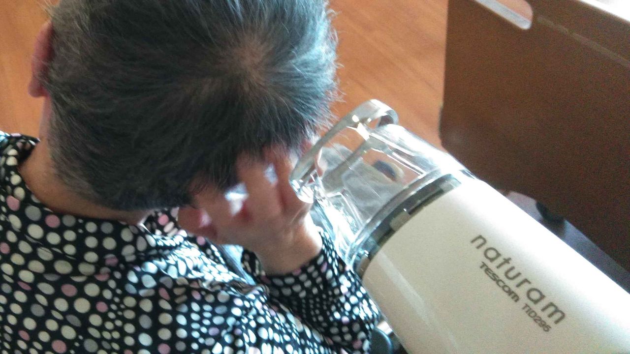 食後の果物として水土はリンゴを届けることにしている。ちゃんと塩水に漬けてから持って行く。この日、特養へ着いたら、丁度風呂から上がったところであった。ドライヤーで髪を乾かしてやる。散髪もしたばかりで短くカットしてもらっていたのですぐに乾く。