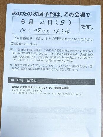 集団接種というからもっと大勢詰めかけて大変なことになっているのではないかと思っていたので肩透かしを食らった気分であった。予診をする先生も一人なら、注射を射つ先生も一人。医師は5人くらいいるのかと思っていたので拍子抜けする。人に聞いた話では、先生は開業医が順番に担当しているのだそうだ。一人しか参加出来ないはずだ。出雲にそんなにたくさんの開業医がいる訳がない。