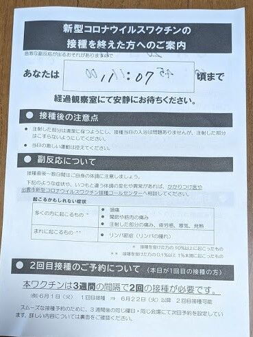 45分前から受付が始まる。予診票、接種券、免許証をチェックして中で待機。待機しているのは3人ほど。マスクして話はするなと貼紙があるのに、隣の人が話しかけて来たので相手をしていたらすぐに呼ばれて、カーテンの向こうの予診室へ。医師が一人居て予診票をチェックし一分で終了。待つほどもなくすぐ隣のカーテンへ通されて注射。女医さんだった。一応ちくっとしますよと言われたが採血の注射の方が圧倒的に痛い。こんなに痛くない注射は生まれて初めて。