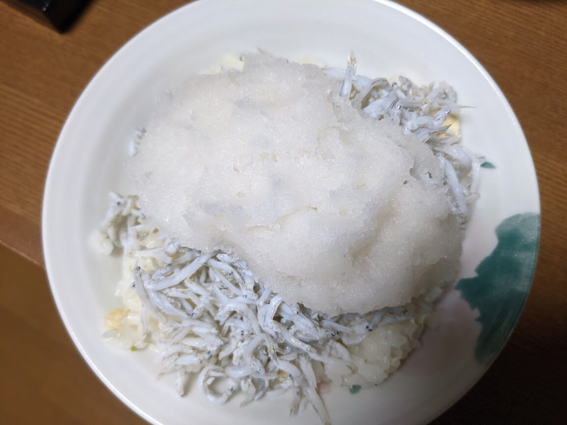 2合も炊いたので余った御飯で、翌日はシラスに大根おろしをのせて食べる。写真では大根おろしが多過ぎて山賊の飯みたいだが旨かった。三日目はメカブをのっけて食う。これもまあまあであった。この他にも考えたら色々出来そうな気がする。