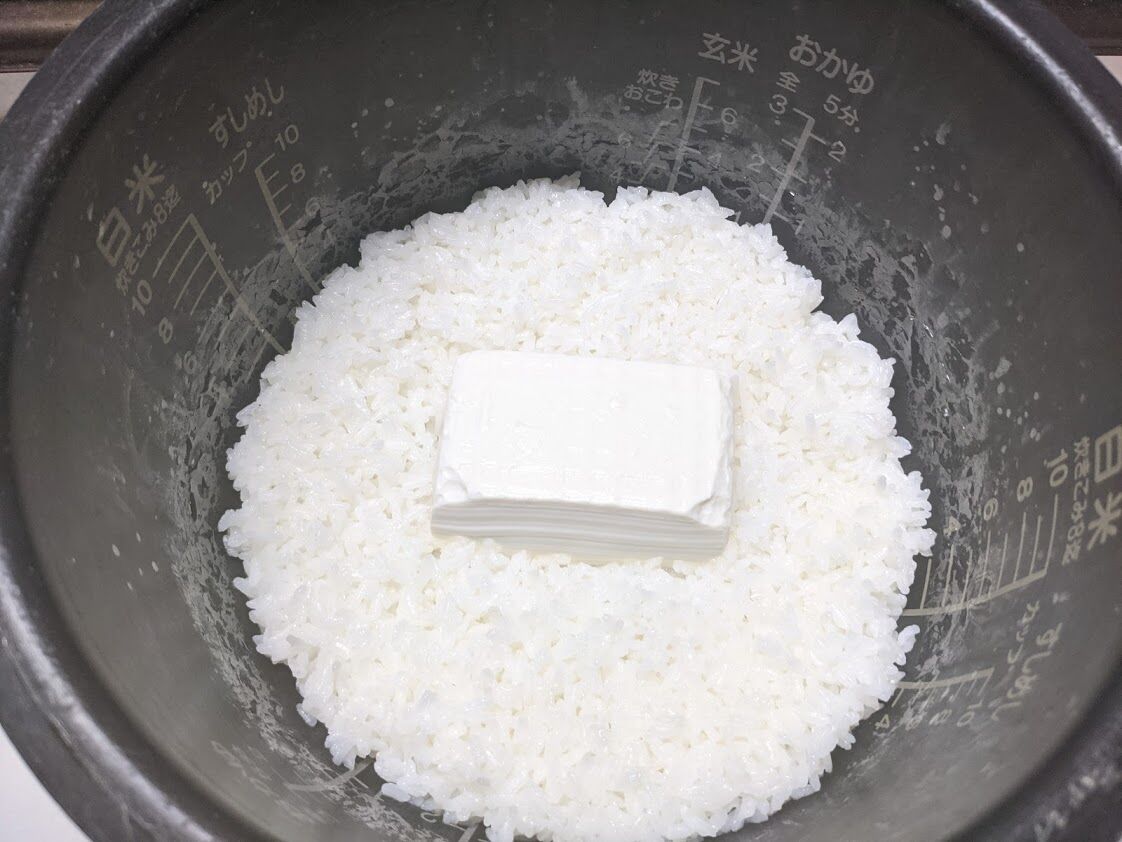 2合の米に絹豆腐を一丁入れて炊くだけ。水の量は2でそのまま。