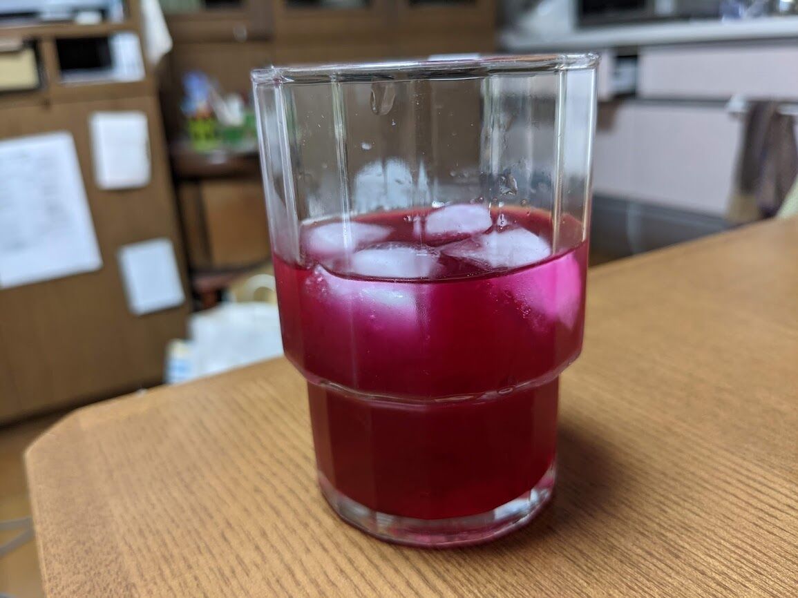 これは昨日、畑先生から貰った紫蘇ジュース。毎年、この時期に貰う。毎年、春野菜が終わると己ばえの紫蘇が芽を吹き、一気に大きくなる。