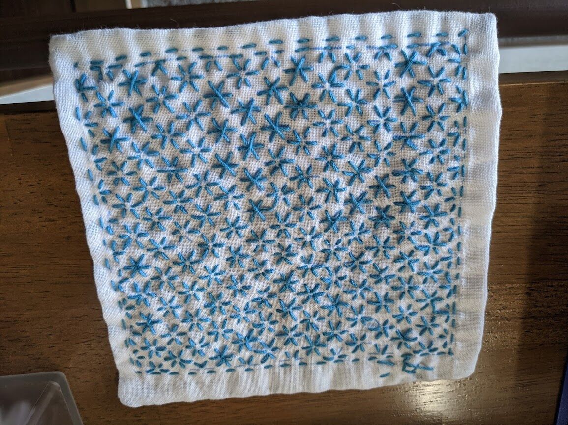 右の柿3つは隣家の熟柿。左の2つは我が家の柿。母は熟柿が大好きなので、隣の柿を勝手にとっては(取っていいことになっている)母に届けている。10月中には4回ほど届けた。土曜日には必ず女性週刊誌を届けている。右の刺し子は妹が送ってくれたもので夜一人で縫ったそうだ。物忘れはひどくなったがまだこんな細かいことが出来るとわかって喜んでいる。