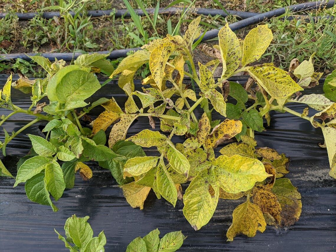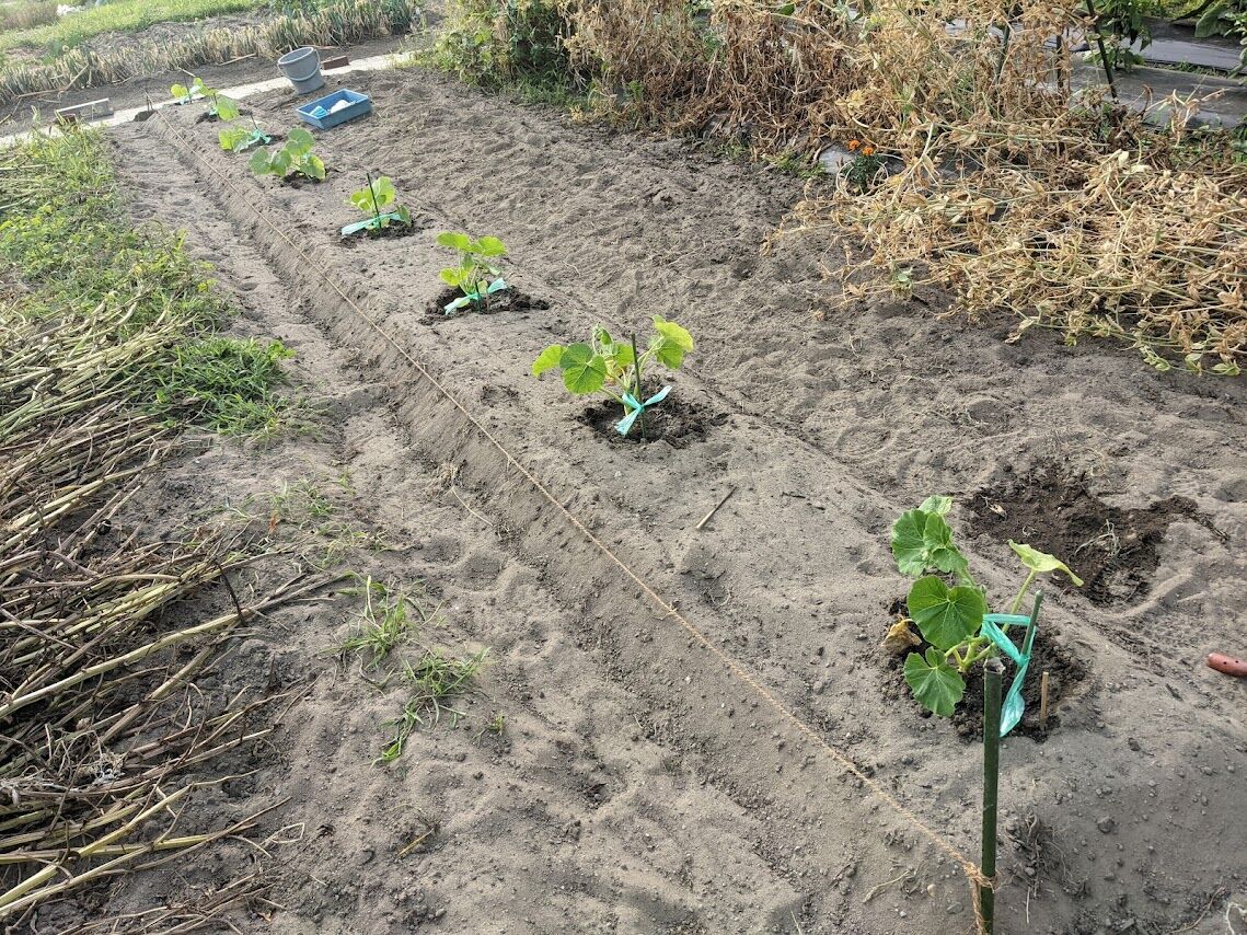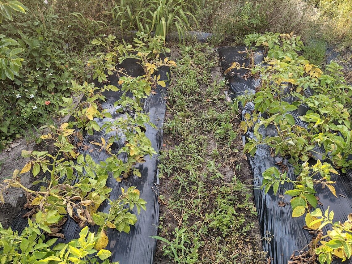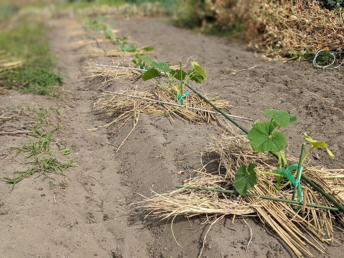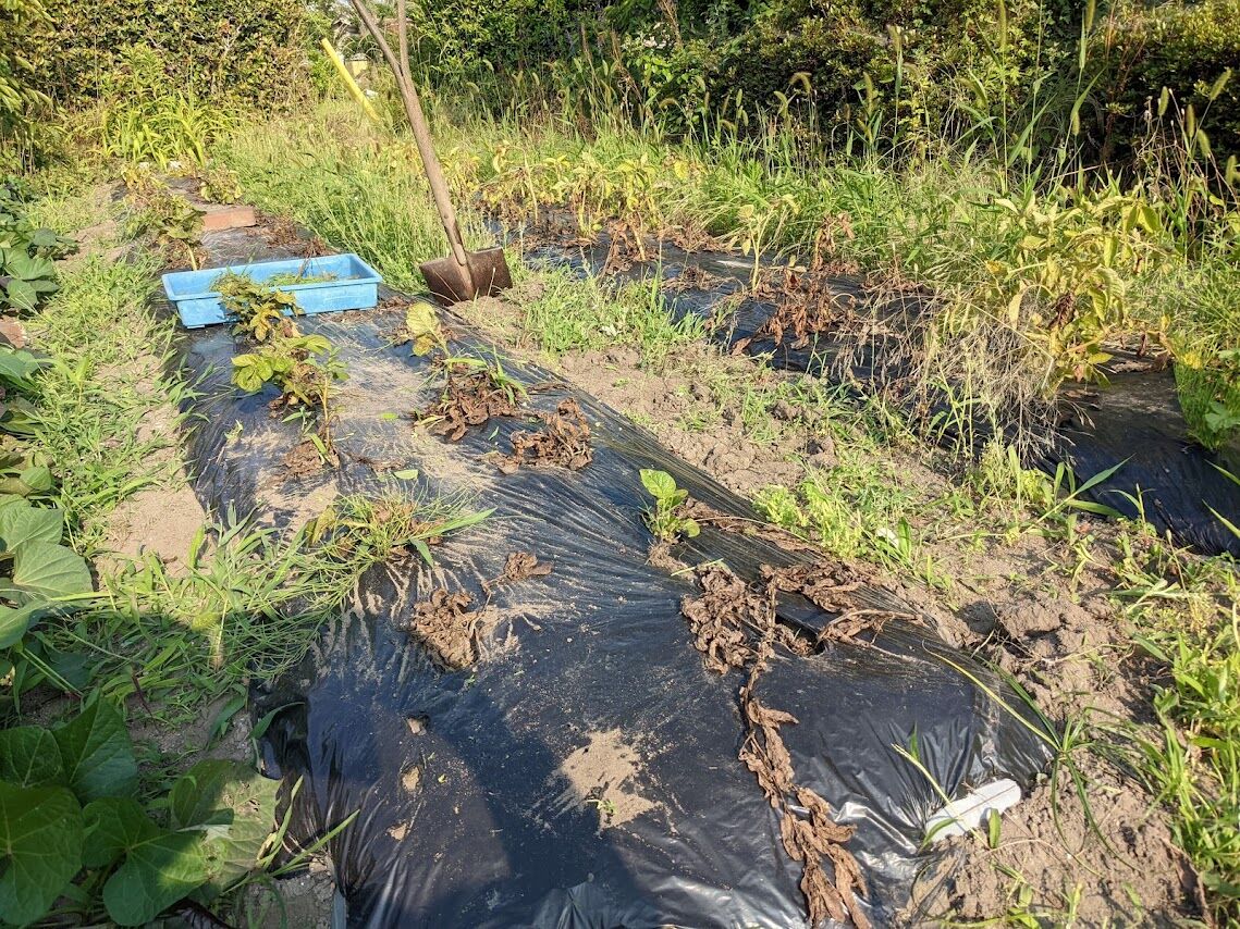 左)マルチを剥いだらこんな感じ。本当ならもう少し顔を出していてもいいのに少ししか顔を出していない。