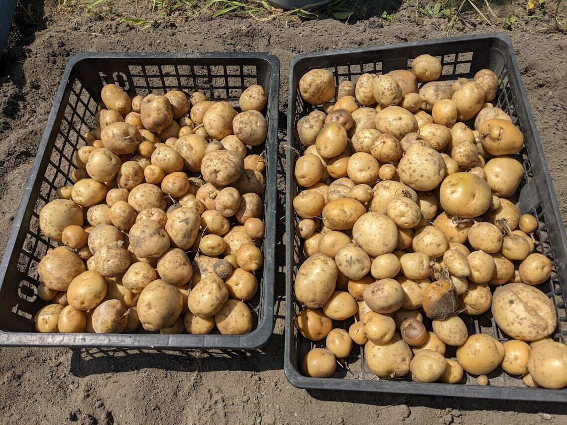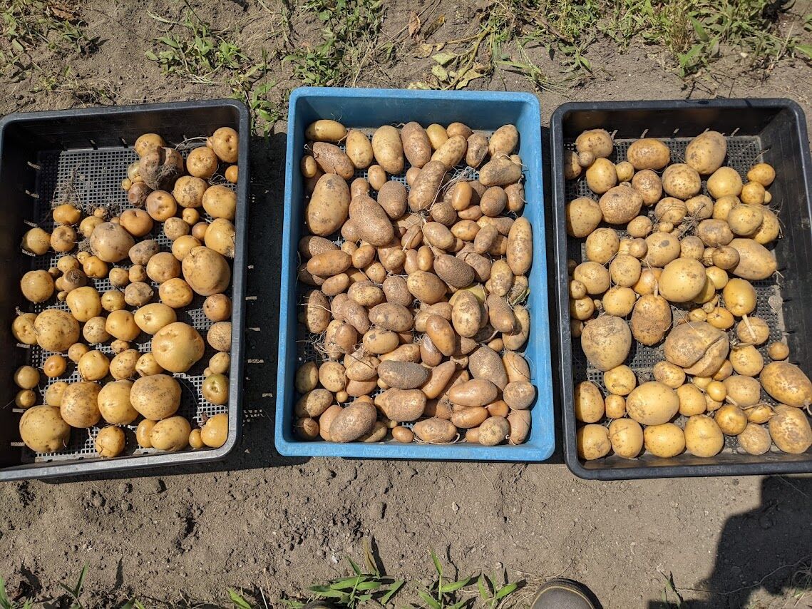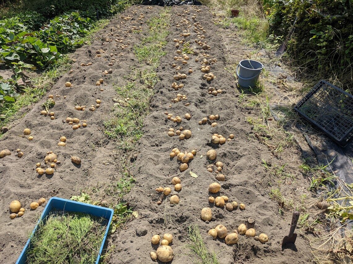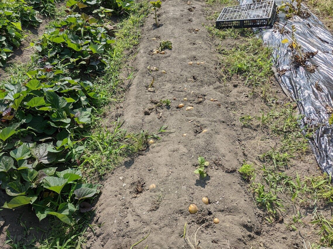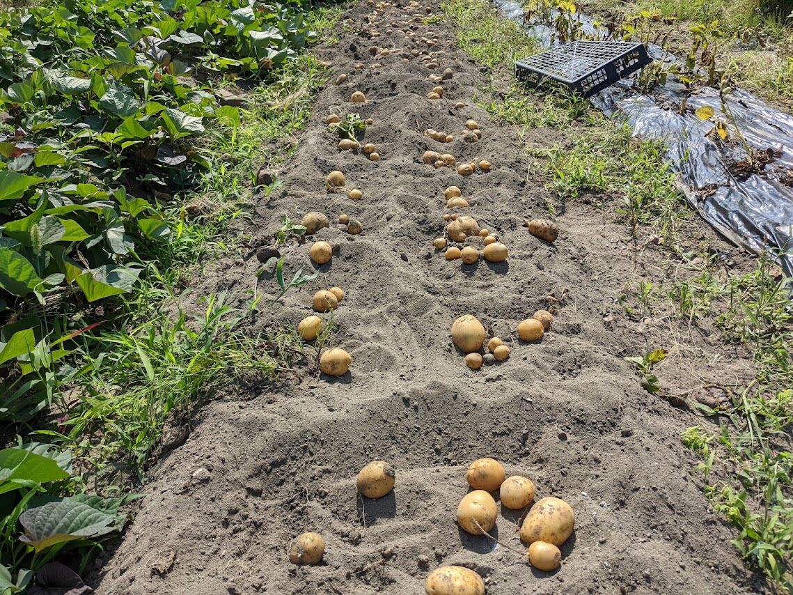 次にその右隣の畝のマルチを剥ぐ。ここに植えたのは定番の男爵。左の畝のキタアカリ、メイクイーン、とうやと比べてみると、男爵の方がやや大きいことがわかる。さすが定番のじゃが芋と感心する。昔から作られているじゃが芋でこの何年かは新しい品種にばかり浮気していたのだが、今年は何気に定番のじゃが芋を植えてみようと思ったのである。定番の芋を植えておいてよかったと少し胸をなでおろす。と言っても数は哀しいくらいに少ないのだ。
