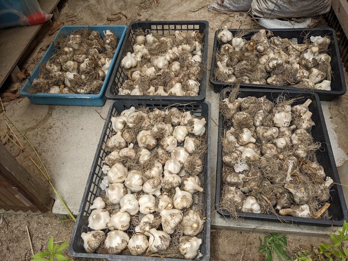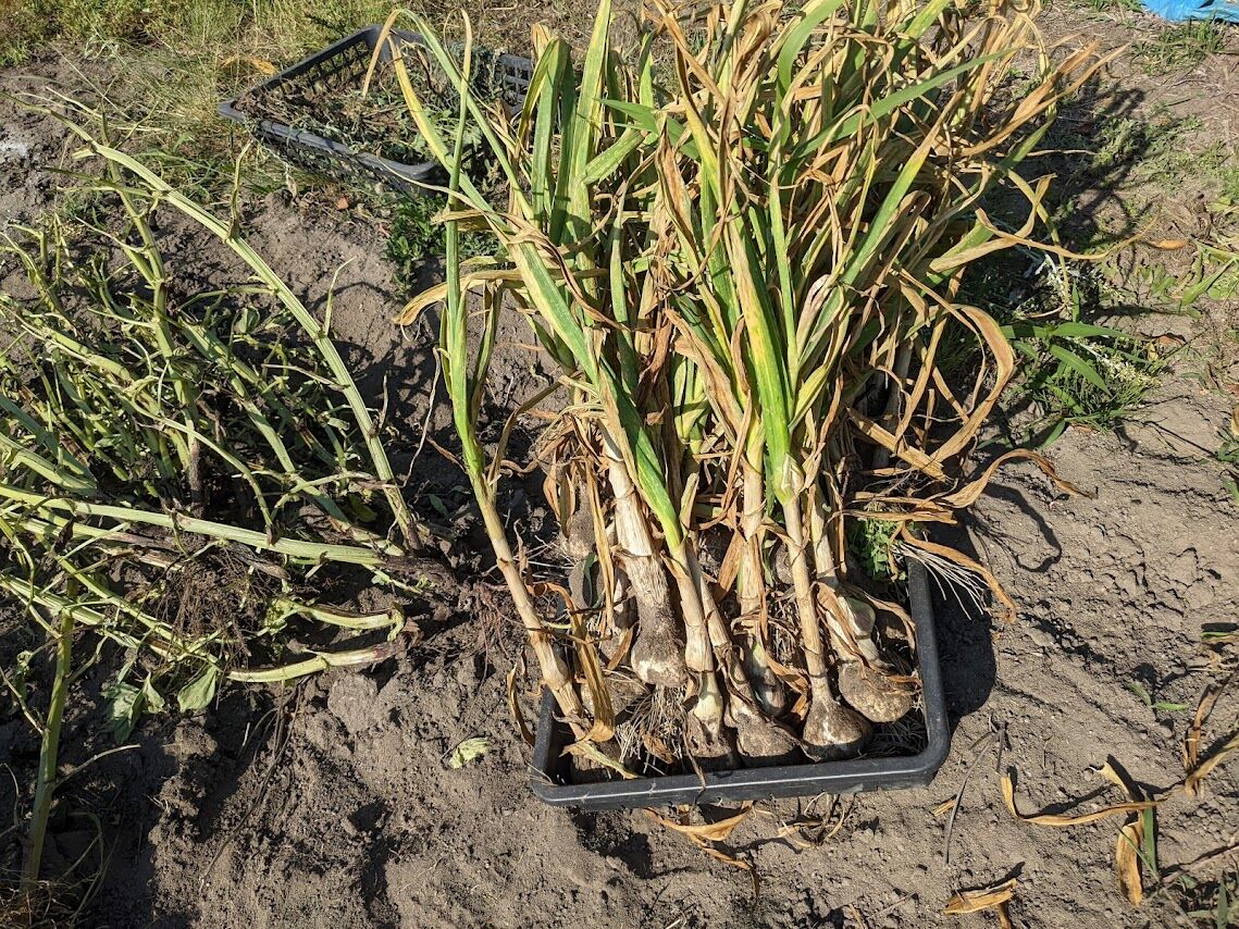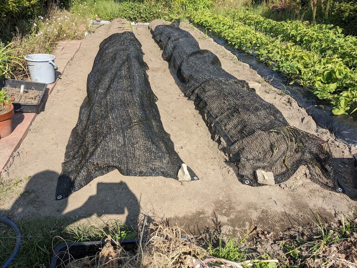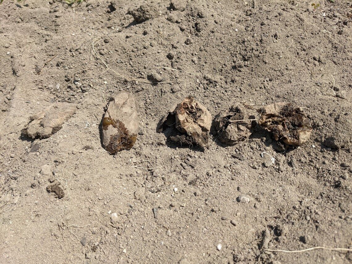 右)土を払いのけるように掘り出してみたらこんな感じ。二列に植えたから明らかに少ない。
