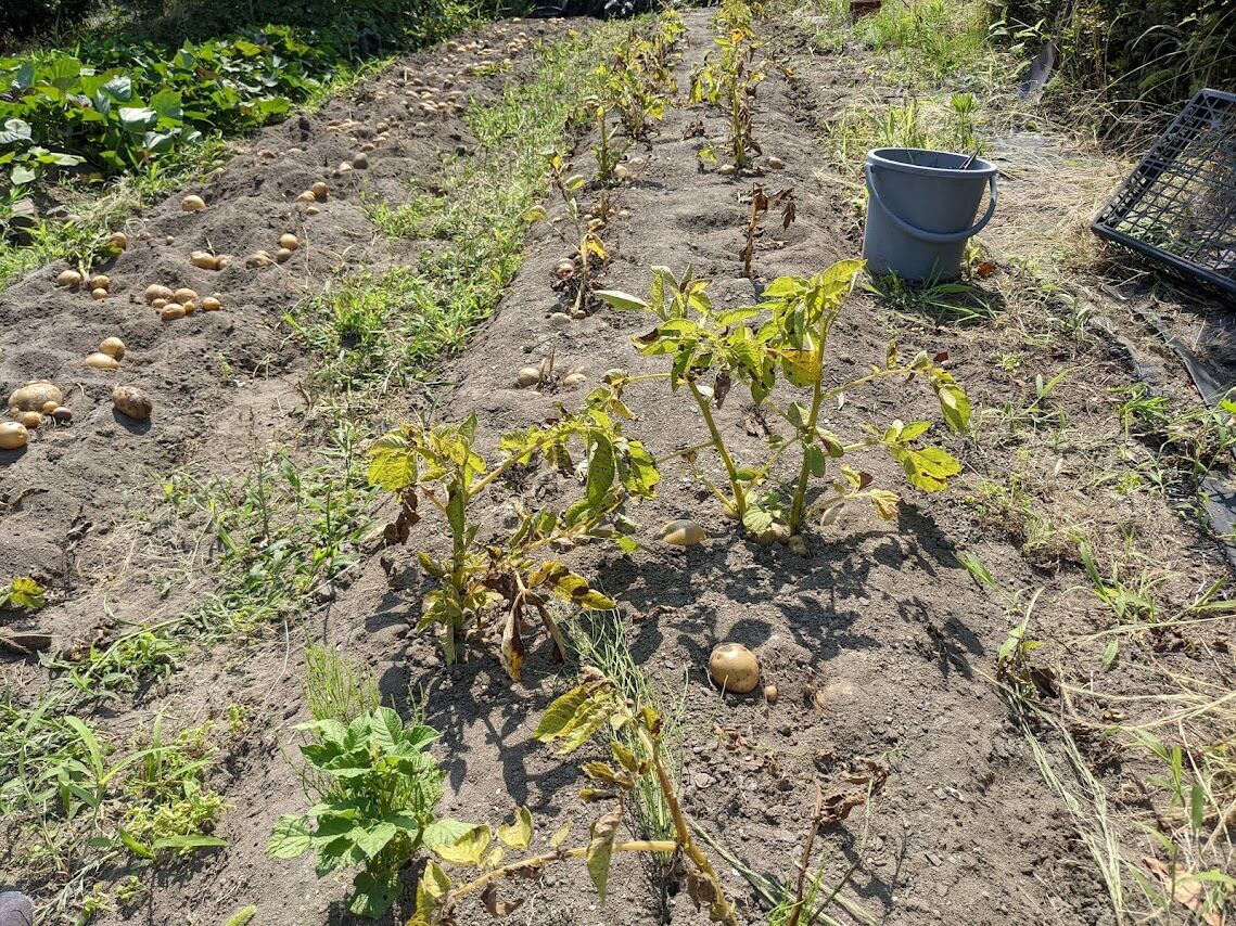 このしわしわは2月に植えたじゃが芋の種芋。このしわしわの一個がたくさんのじゃが芋を育てる養分となっているのだ。養分を全部使いきった出がらしの状態である。ところが枯れ切らない、葉っぱの黄色い勢いのないやつの下には種芋が植えた時とほとんど同じ状態で残っているのだ。(証拠写真を撮ったはずなのだがなぜか見当たらず)。もちろんその下には芋は殆どで来ていない。どうしてそうなったのかがわからん。