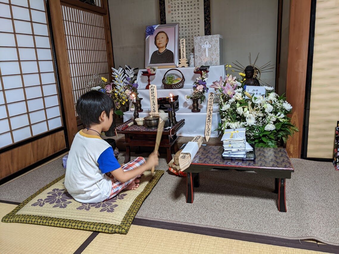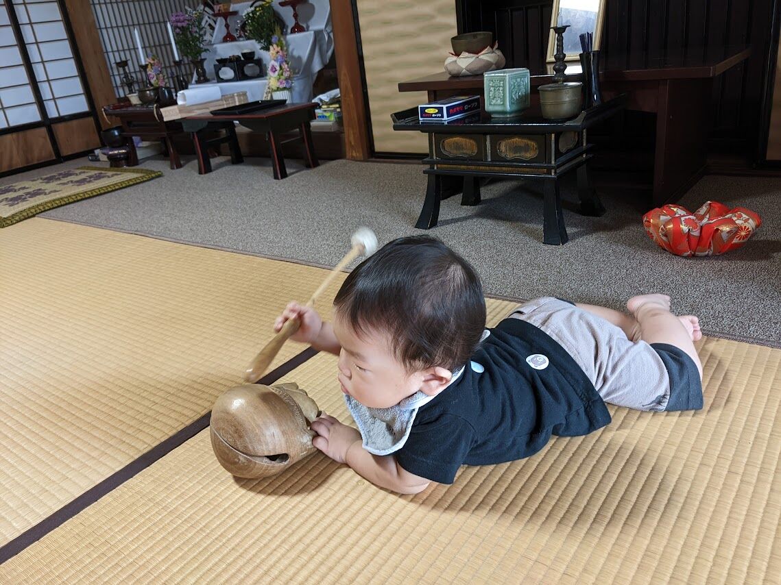 長男の子は葬儀の翌日、木魚を叩き、鐘を叩いた。坊さんのリズムを覚えていて、そっくり真似して鐘を叩いていた。長女の子も音がする物は何でも好きでしきりに叩こうとしていた。