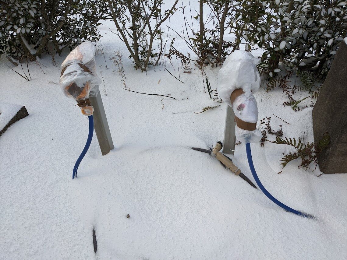 26日の朝は少し雪が減っていた程度。池は凍っていた。