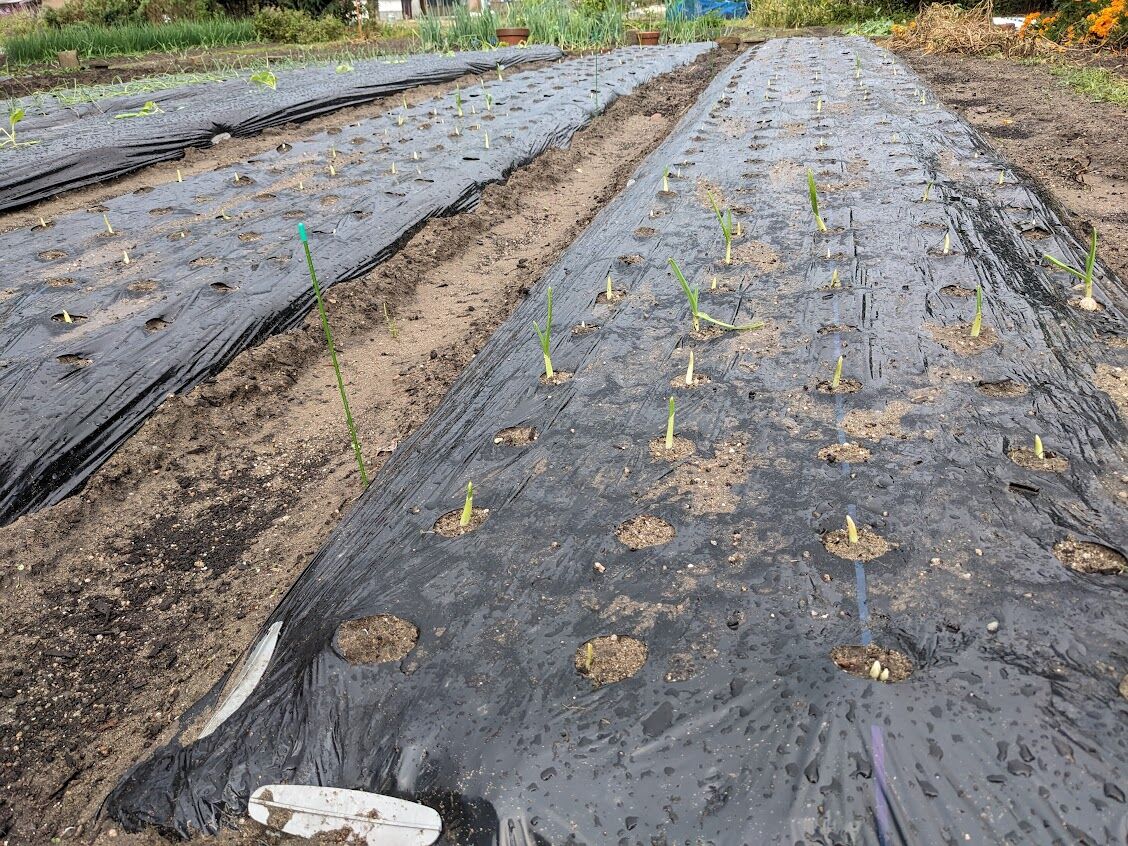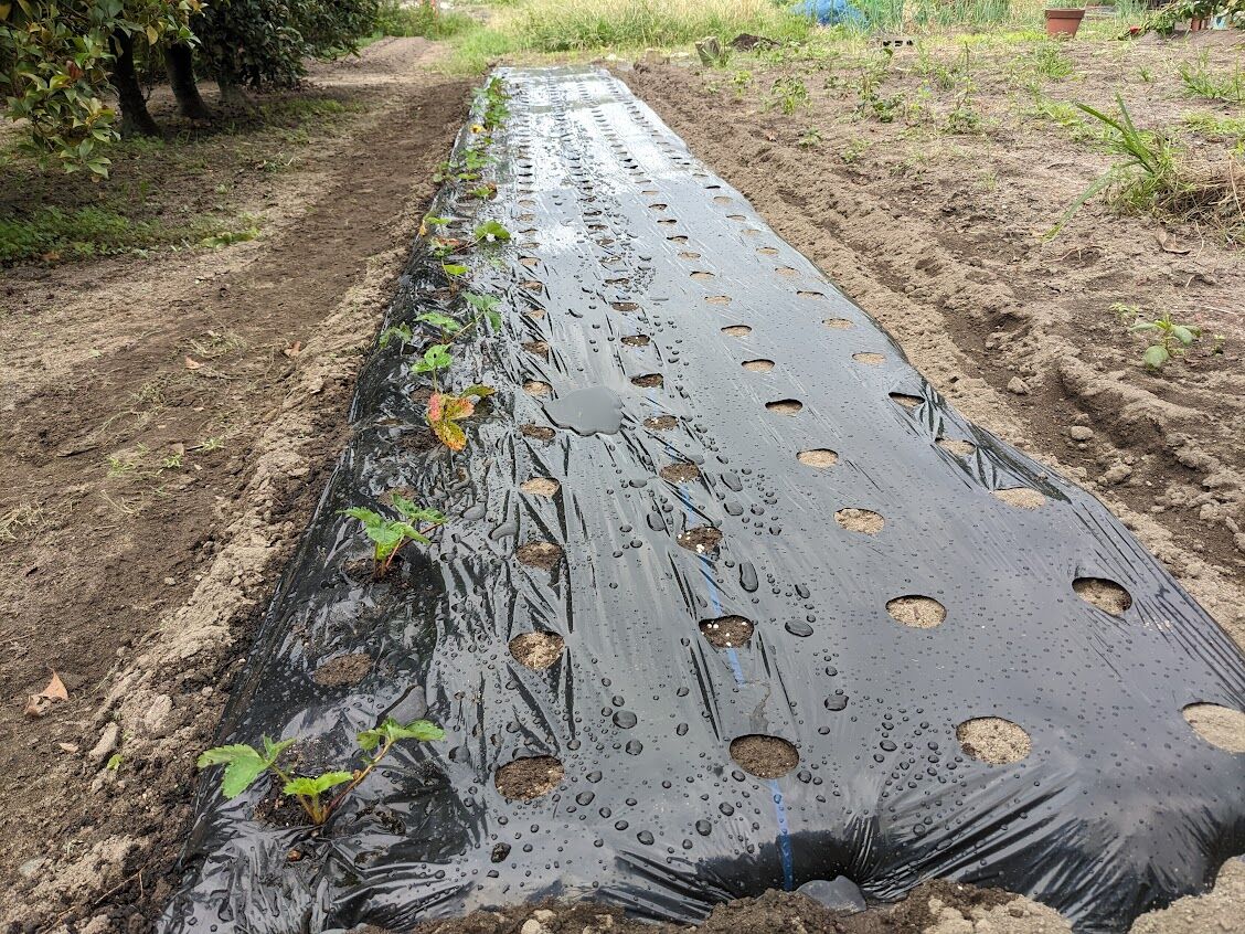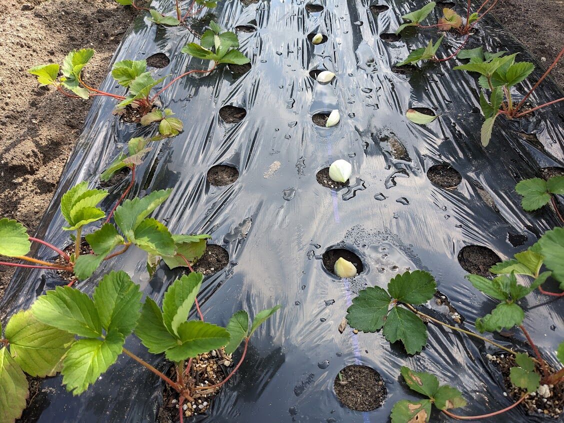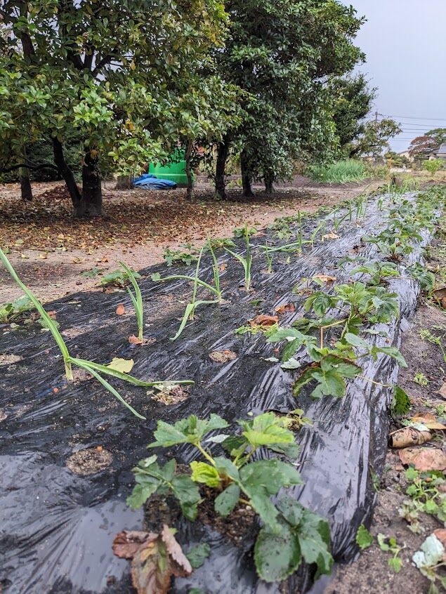 9月末に植えたイチゴと10月1日に植えたニンニクの混植畝はニンニクは無傷。イチゴの葉っぱが少し傷ついた程度ですんだ。