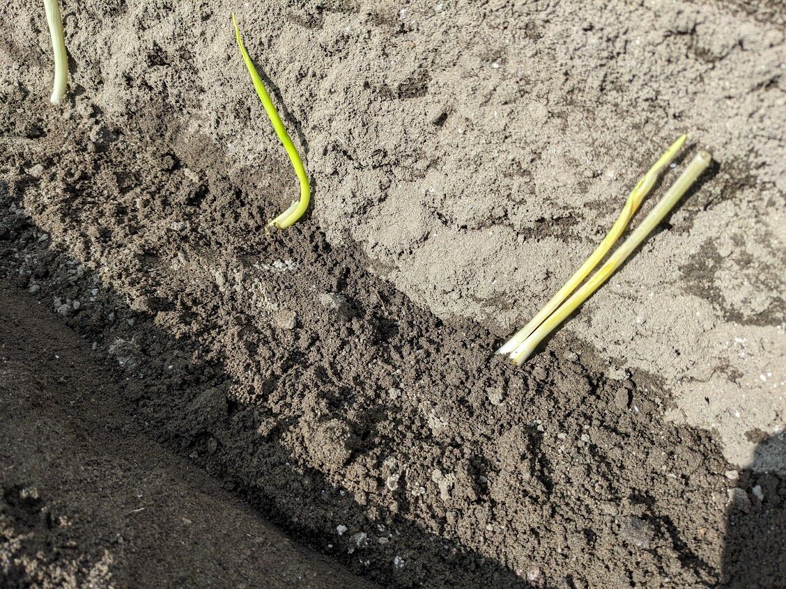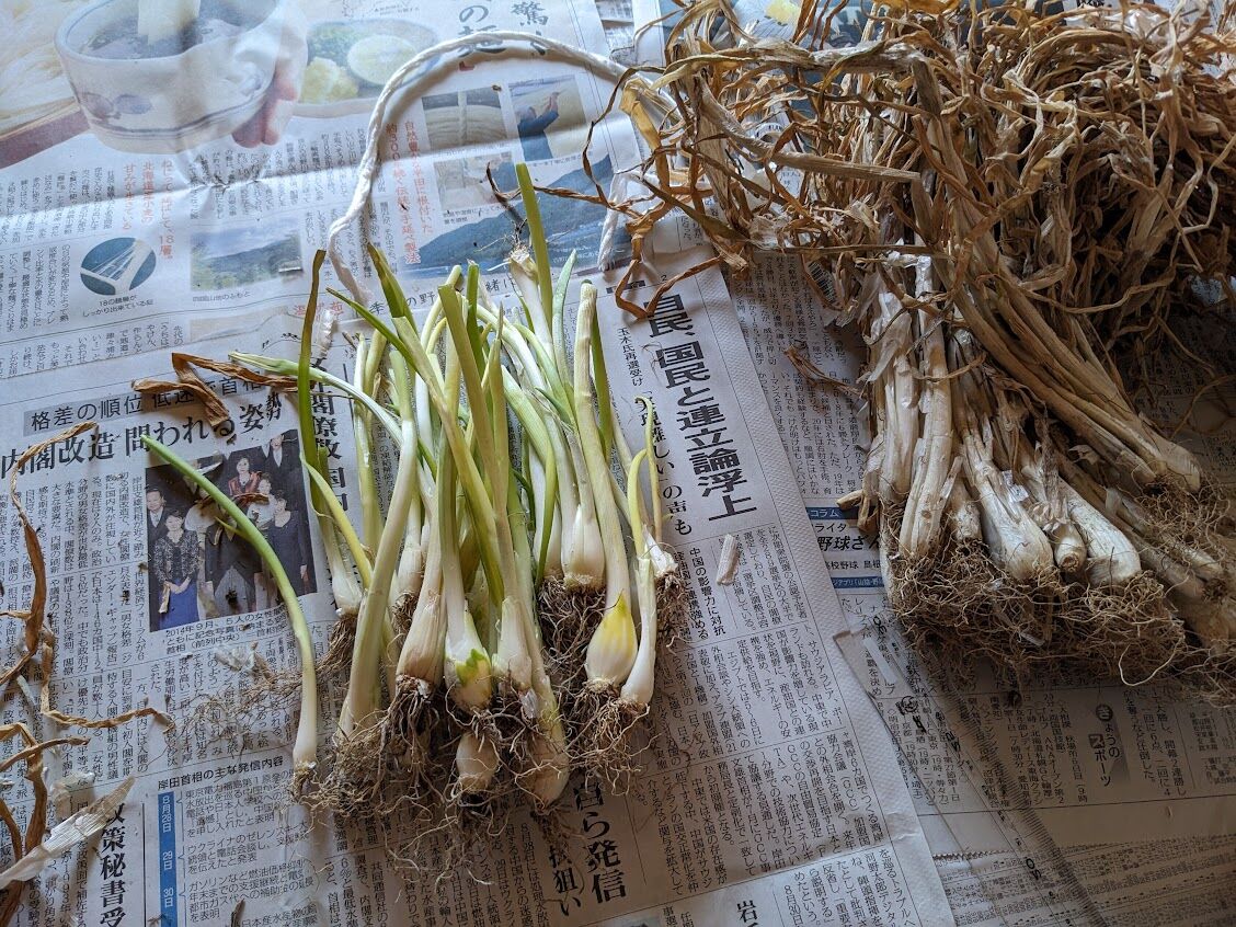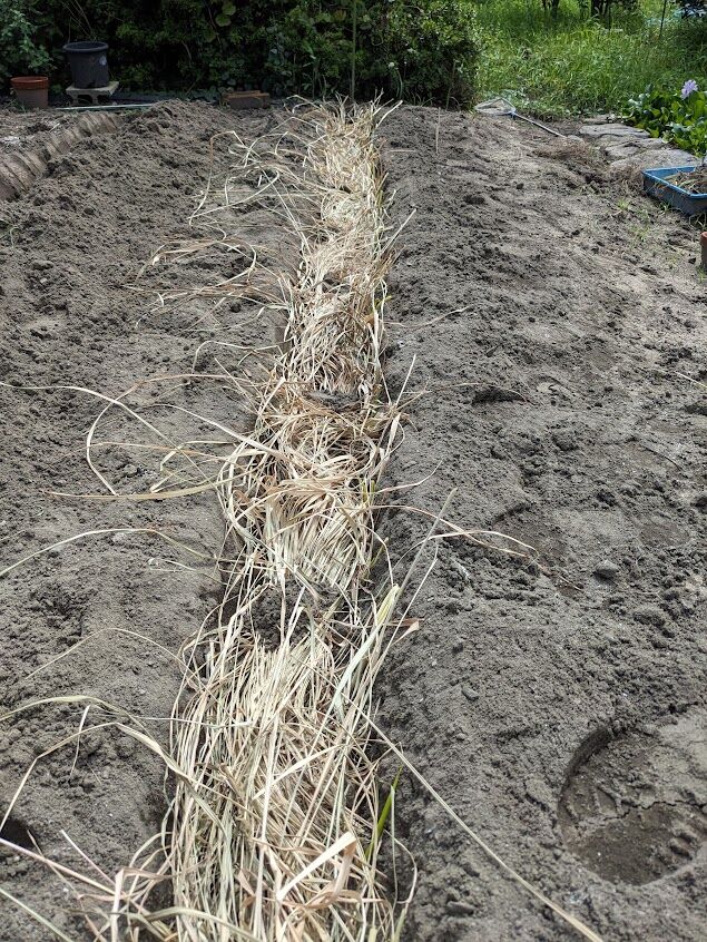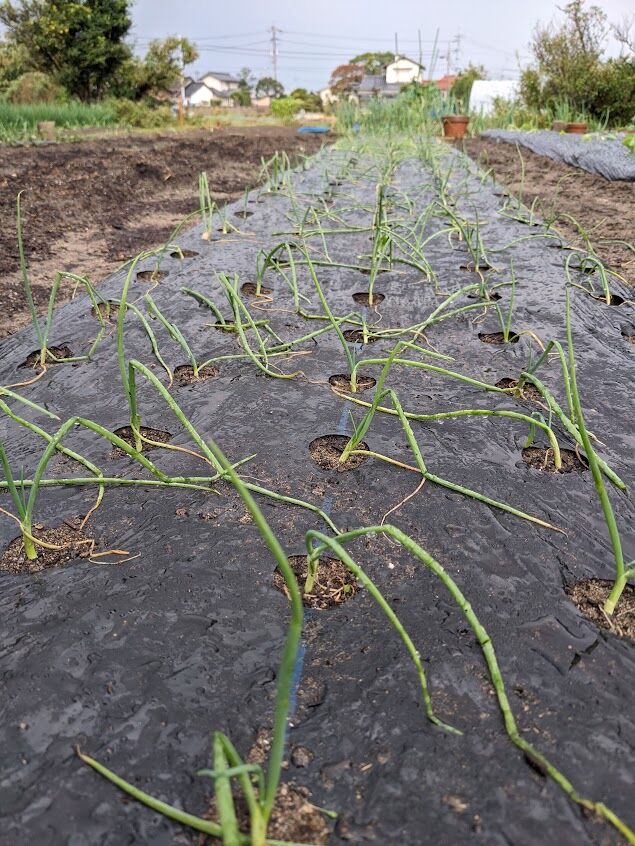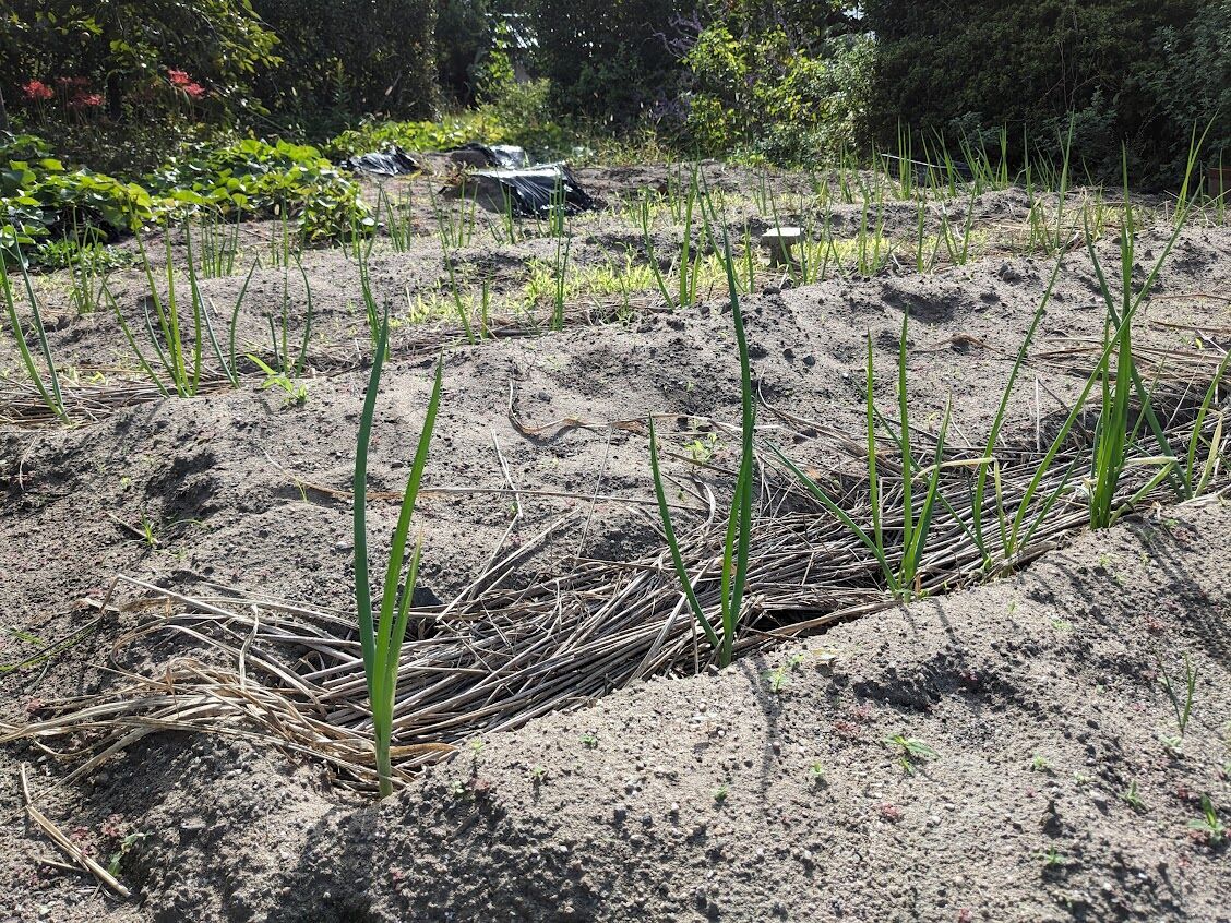 これは10月21日と24日に植えた極早生玉ねぎの「貴錦」150本。奥が10月22日に植えた早生の「ソニック」100本。今年は極早生と早生しか作らない。誰もが作る晩生の玉ねぎ(普通の玉ねぎ)は作らないことにしたのだ。今年のような天気だとうまく作れないような気がしたのだ。吊るして保存したものもみなどんどん腐って落ちたと言っていた。極早生と早生は生で食べると美味しいし、早く収穫できるのがいい。