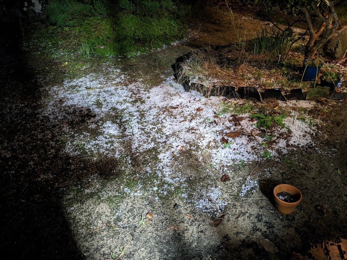 大きな雹がうっすらと積もっていた。夜が明けて6時半ごろに芝生の上の雹を写す。真ん中の大きい雹は軽く1 ㎝を超えていた。こんな大きな雹を見た記憶はない。田舎に帰って初めて。屋根が大きな音を立てていたはずである。まさか雹が打ち付ける音とは思わなかった。