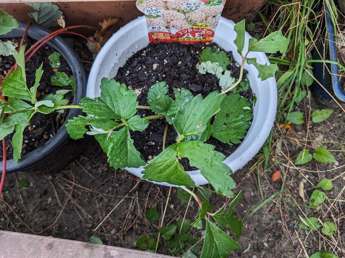 右の鉢植えの苺は松江の孫のために植えた白いイチゴ「天使の苺」。(数が出なくて、売り切れていたので楽天で取り寄せた苗)。少し傷ついたがこの程度なら心配することはないだろう。