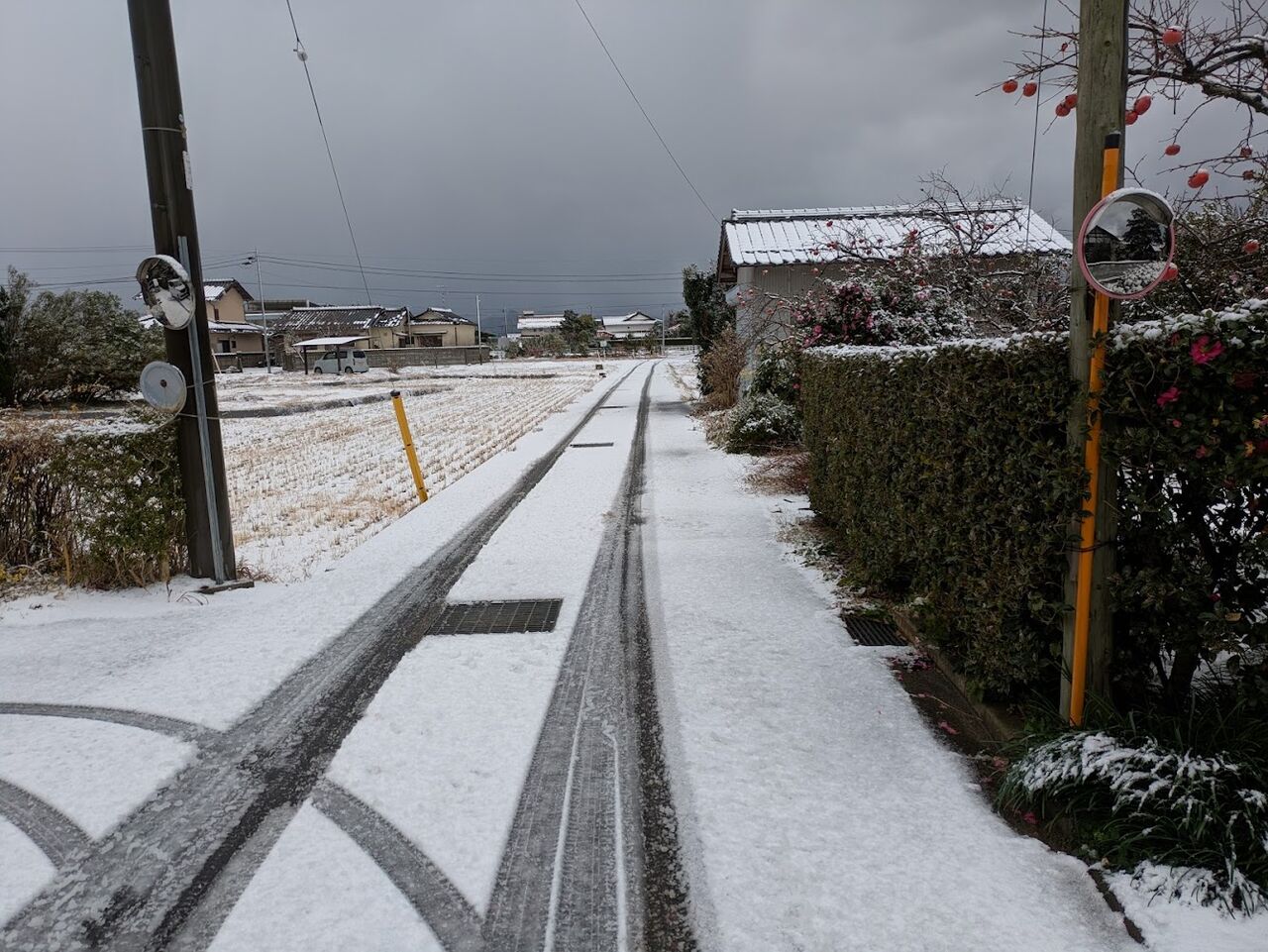 右)正面左が我が家。家の横の道はあっと言う間に真っ白になっていた。写真ではわからないがものすごい雪が降っている。