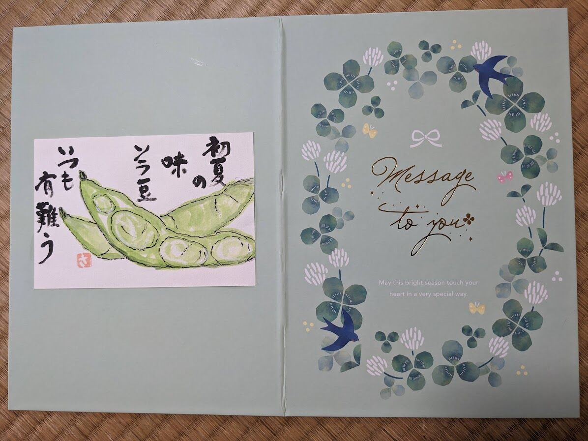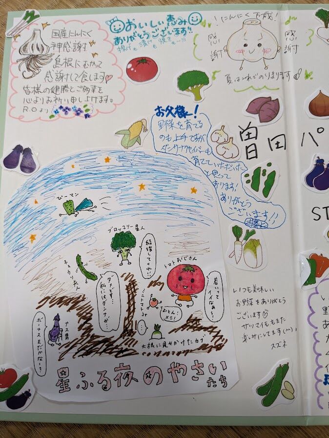 私は何年もそこに自分が作った野菜を送っていたのだが、娘が島根に帰って来てからも送っていて、この春も新玉ねぎや空豆、ニンニク、じゃが芋などを送っていたのだが、その礼状を寄せ書きにして送ってくれたのである。