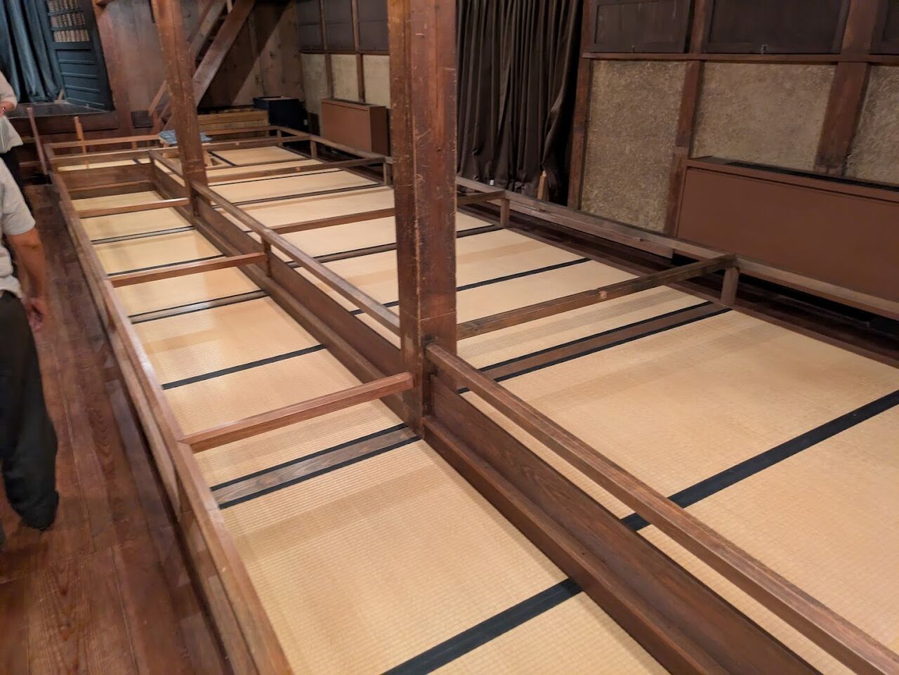 右)花道の下の通路。ここから役者が花道に出現する仕掛けもある。手前にあるのが4人がかりで役者を担いで乗せる台。4本の足があるのだが、手前に2本あるのがそれ。