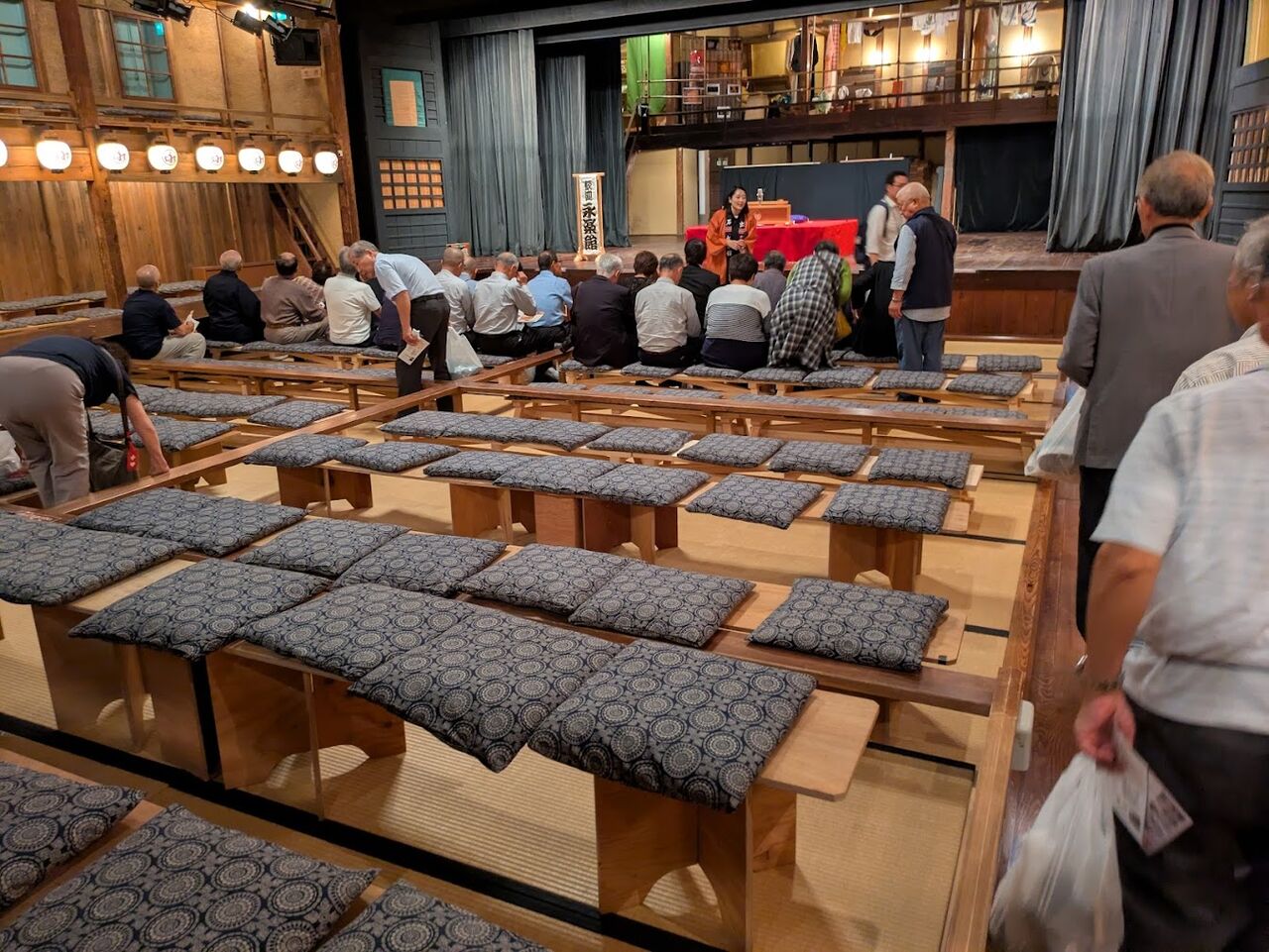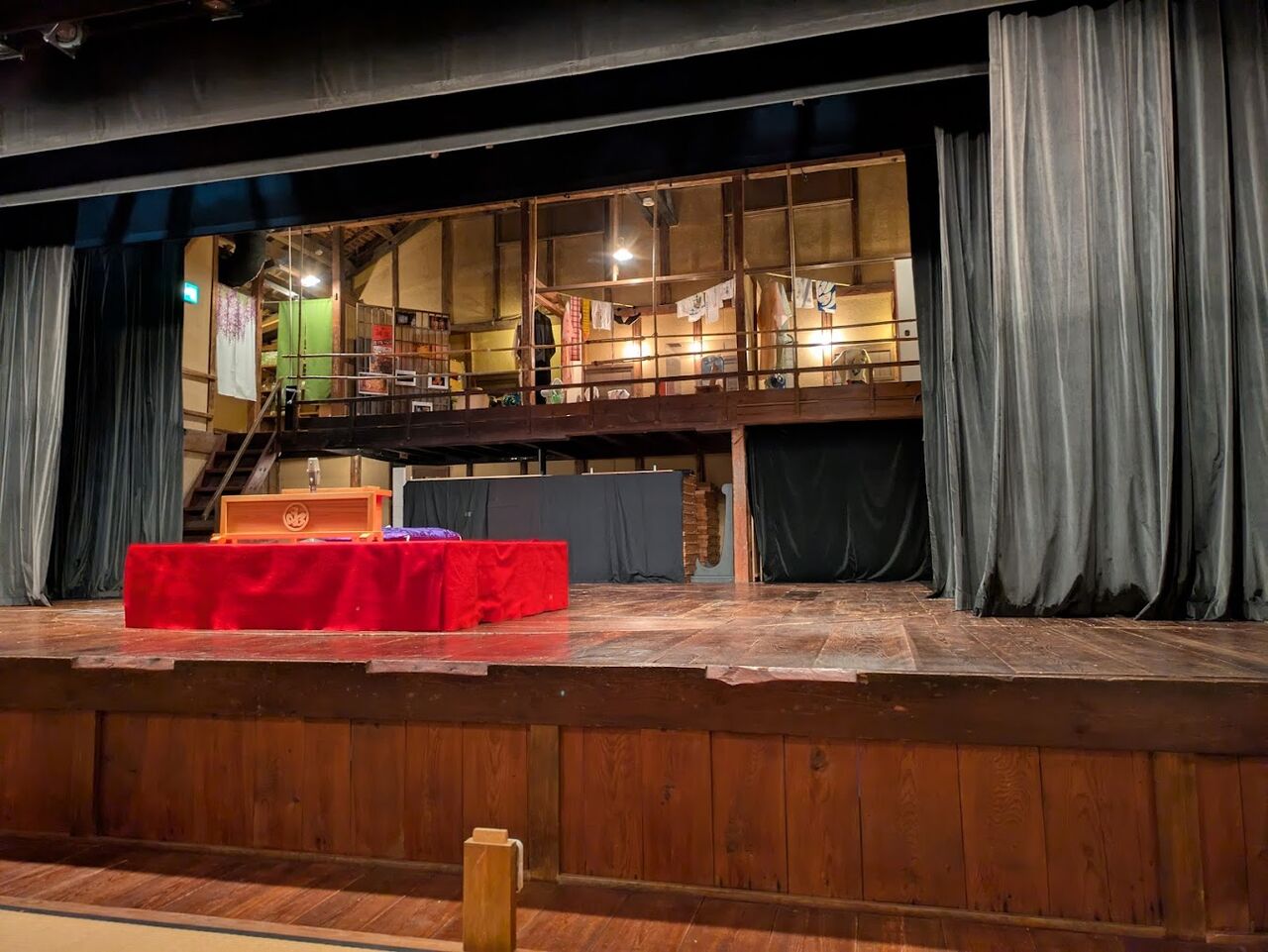 江戸時代の芝居小屋を明治になってそのまま再現して建てられたもので、近畿最古の芝居小屋。昔は右の写真のように桟敷席だったが、今は桟敷の上に長椅子がしつらえてある。