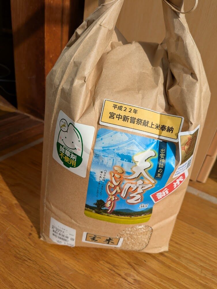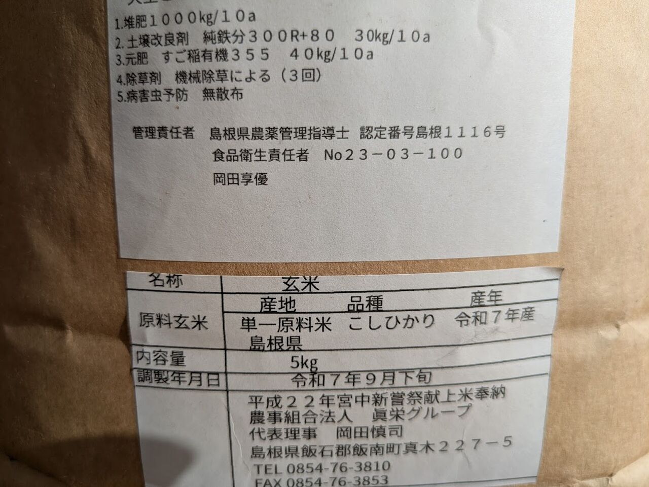 貰ったのは令和7年9月下旬に獲れたこしひかり。飯石郡飯南町という中国山地の山奥の米だから美味いに決まっている。しかも生産者は平成22年に宮中新嘗祭献上米を奉納した農事グループだから間違いない。ちなみに値段は3,704円。税込み4,000円。