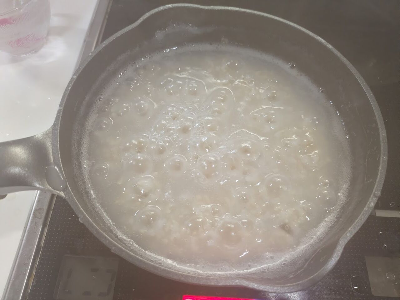 マルコの散歩から帰ったら炊きあがっていたが、白米の時のようなお粥感が全然ない。うっかり混ぜてしまったので白濁してしまったが、水分も1センチぐらい残っていて、玄米の粒粒が透けて見える。試しにすくって食べてみたが、確かに少し柔らかくなっているが、白米のお粥のような柔らかさとは全く別物。口の中に潰しきれない小さなごみのようなものが残る。恐らくこれら微粒が食物繊維の固まりなのだろうか。私のように膵臓を気にしている者は食物繊維の多い食品は避けた方がいいのだが、玄米の栄養素も魅力なので、ここから先は自分で考えてもうひと手間加える。